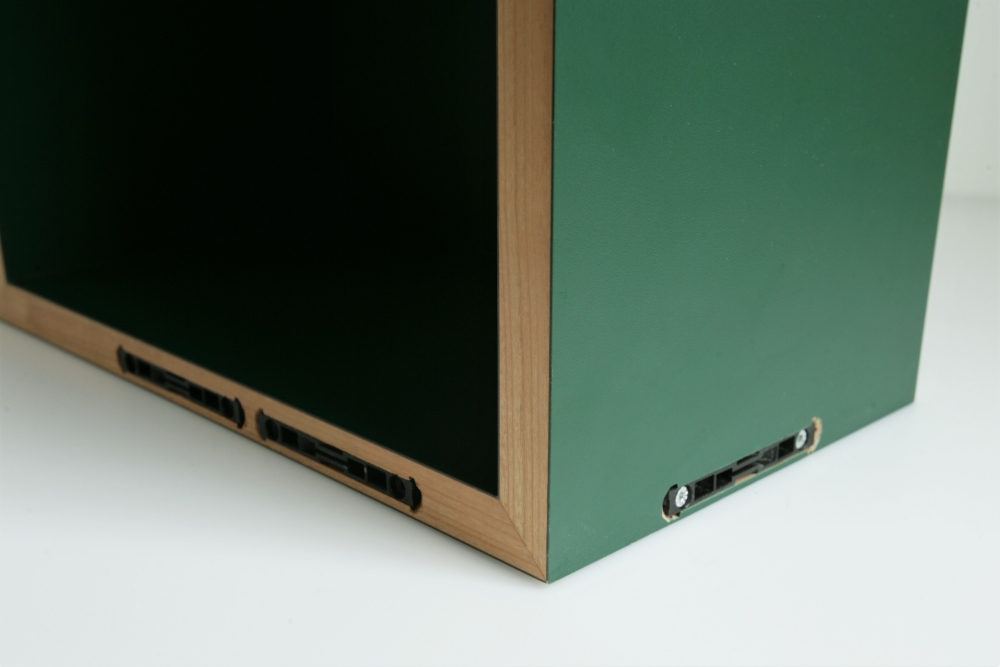 Clamex connectors are similarly shaped to wooden Lamellos, but are made of plastic with a small lever on the male part to lock the two. The two components can be closed and opened multiple times, making the clamex a great connector for knock-down furniture. The lever is accessed through an almost invisible 6mm hole. Clamex connectors can be used on wooden boards for butt joints as well as mitre joints and are extremely useful while gluing mitre joints due to their immense strength. The groove for the Clamex connectors is made using a special Clamex router by hand or on a CNC machine.