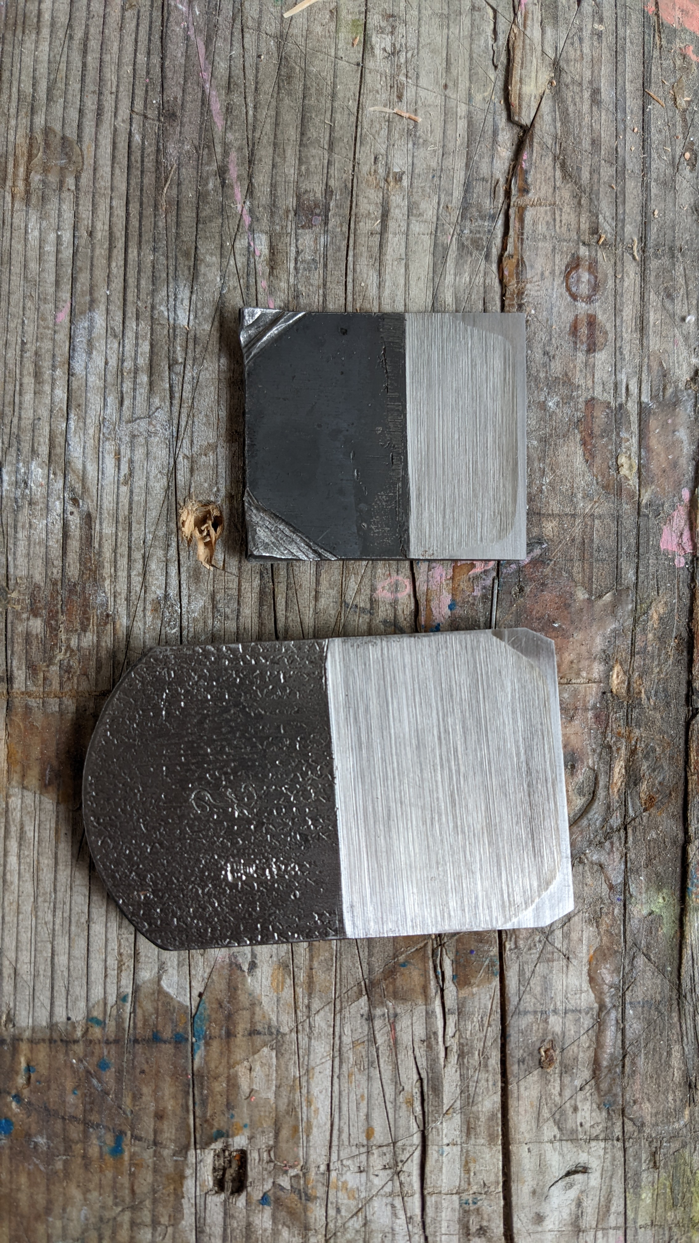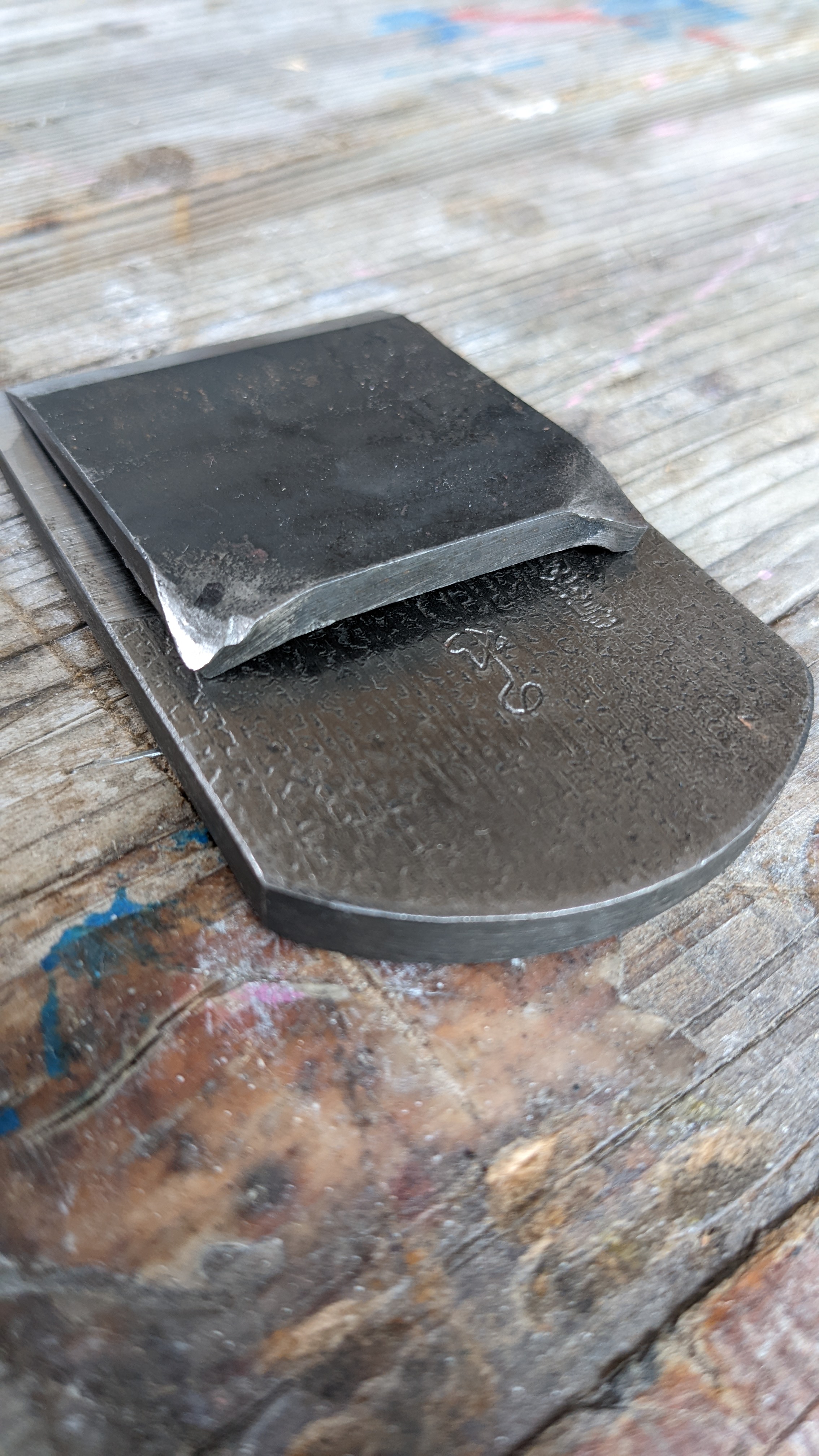 The back of the chipbreaker is also flattened so it is in even contact with the back of the blade, first on an anvil and then on a metal plate. This way it is optimally performing its function. Pressing both tips together, the corners of the chipbreaker need to be adjusted so that there is no wobbling. The distance of between the tips of chipbreaker and blade should be a hair’s width.