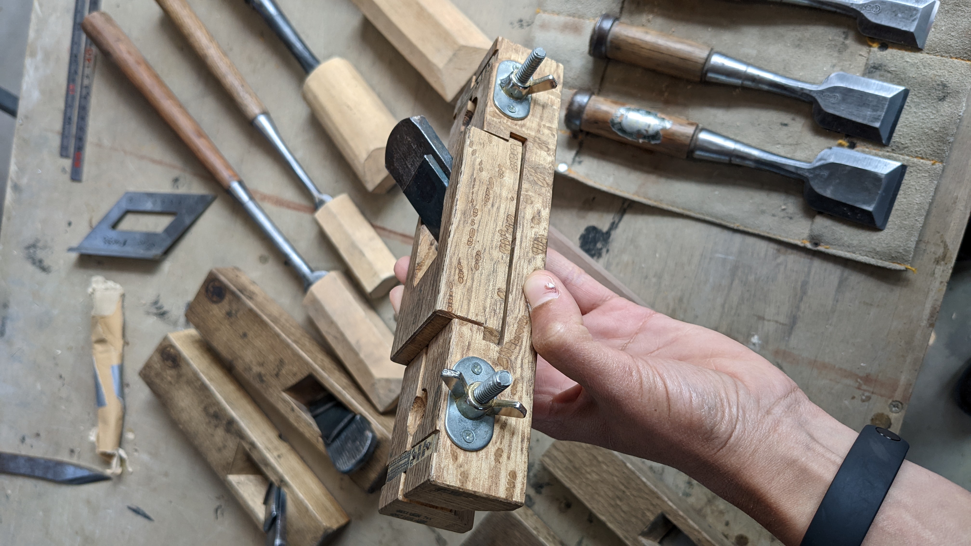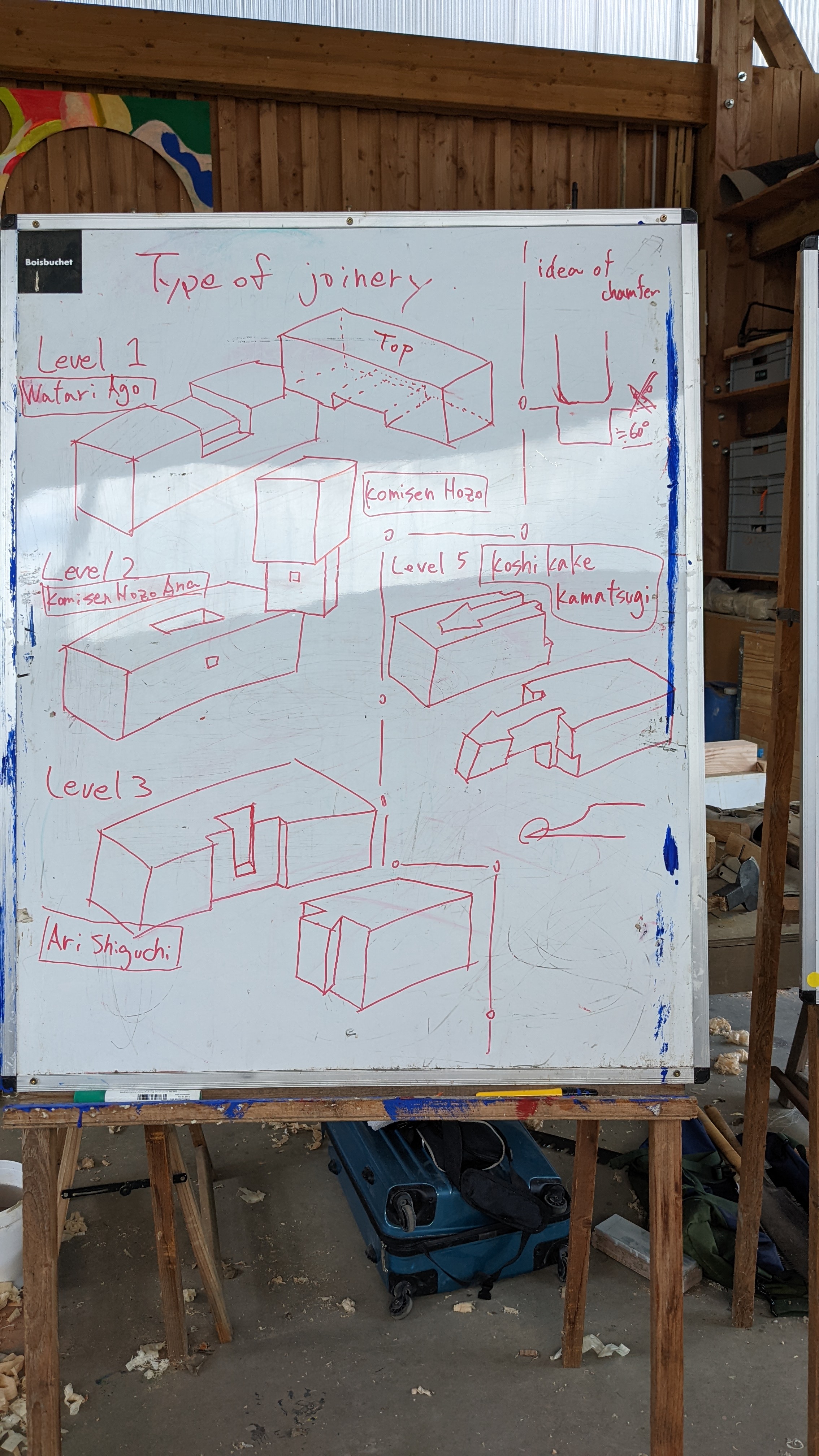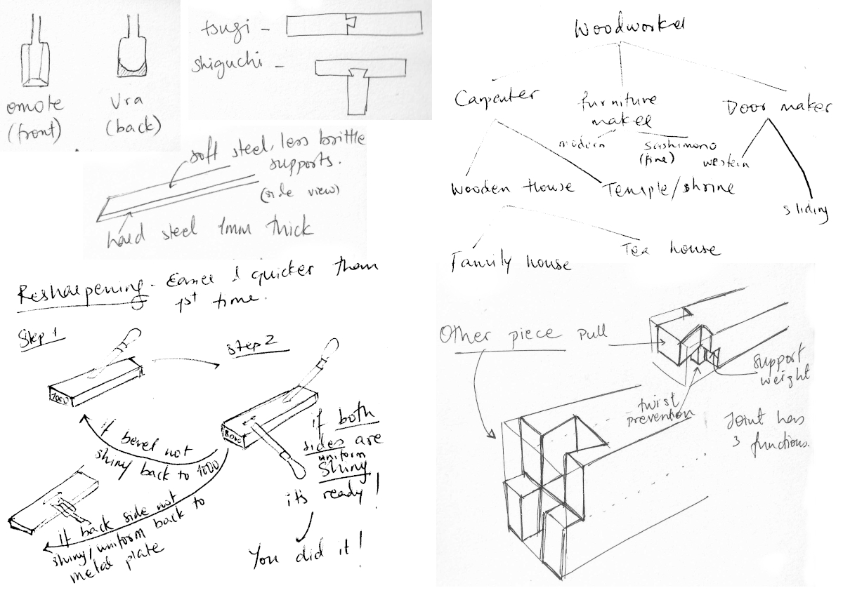 We learnt about all the different kinds of Japanese hand tools like Handplanes Kanna , Chisels Nomi , Hammers, Saws Nokogiri, and Marking equipment like Right angles Sashi gane.