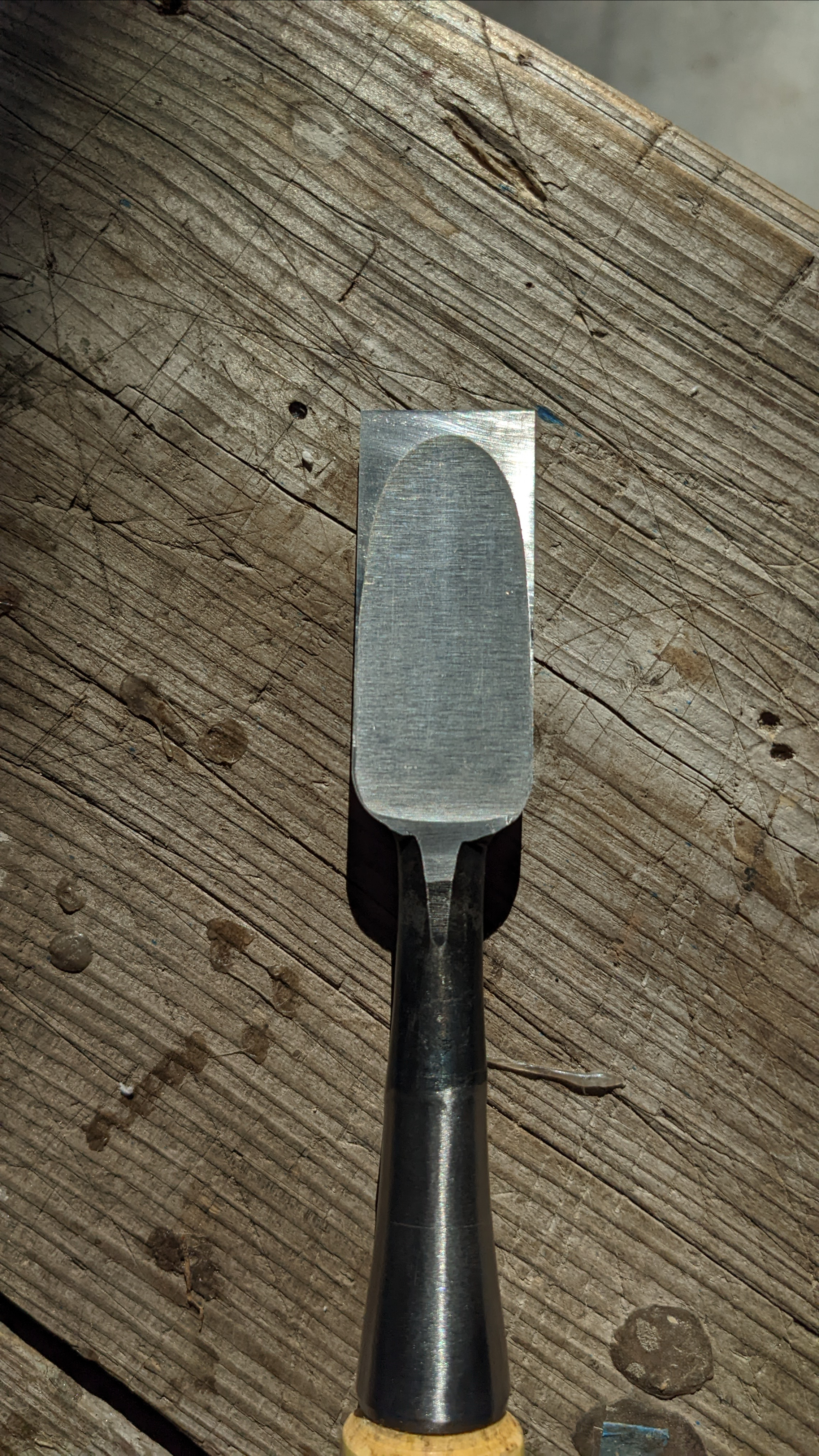 The process of sharpening the Kanna blade is similar to that of a chisel, starting with the flat side and then moving onto the bevel to achieve an even shine across the entire width of the blade.