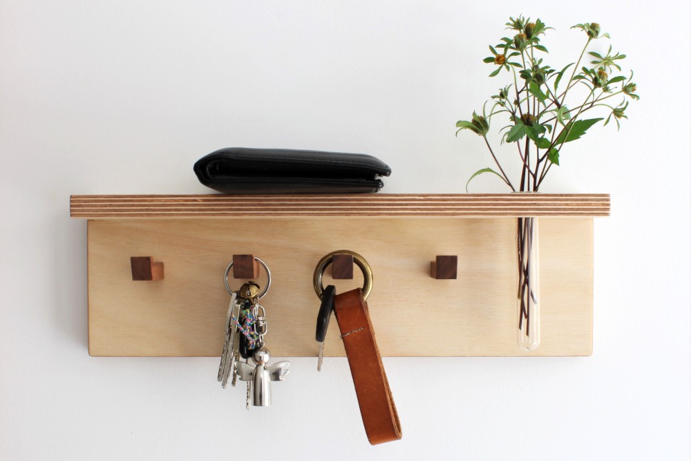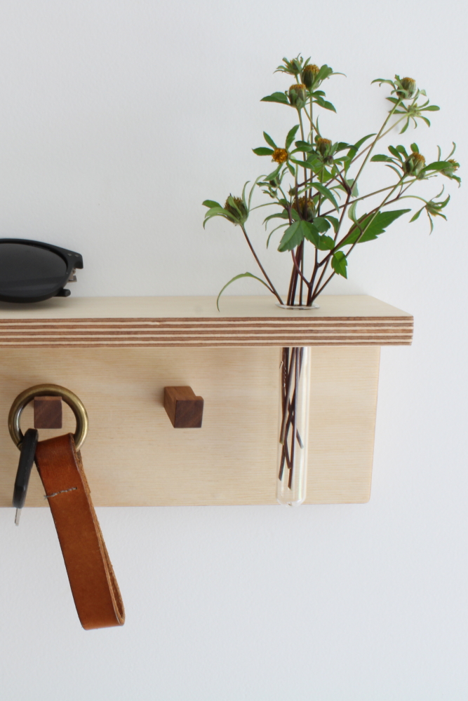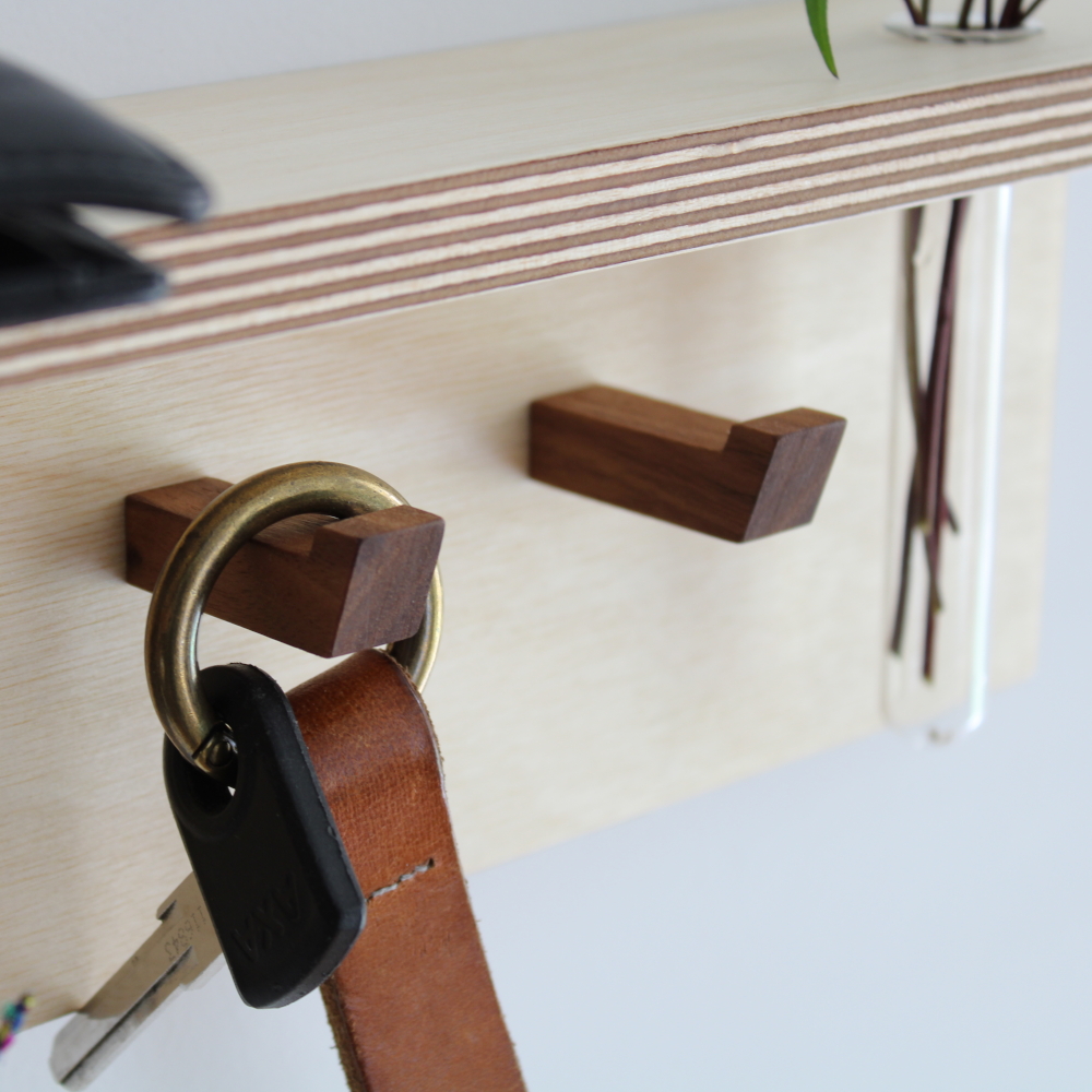 Four handmade hooks made out of Walnut wood mounted on a panel of Birch Plywood. The 6 cm wide top surface features a Glass flower vase to display dried or fresh flowers. Finished with Hardwax Oil.