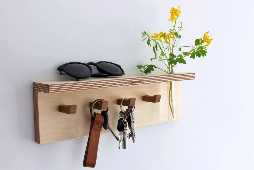 Four handmade hooks made out of Bamboo mounted on a panel of Birch Plywood. The 6 cm wide top surface features a Glass flower vase to display dried or fresh flowers. Finished with Hardwax Oil.