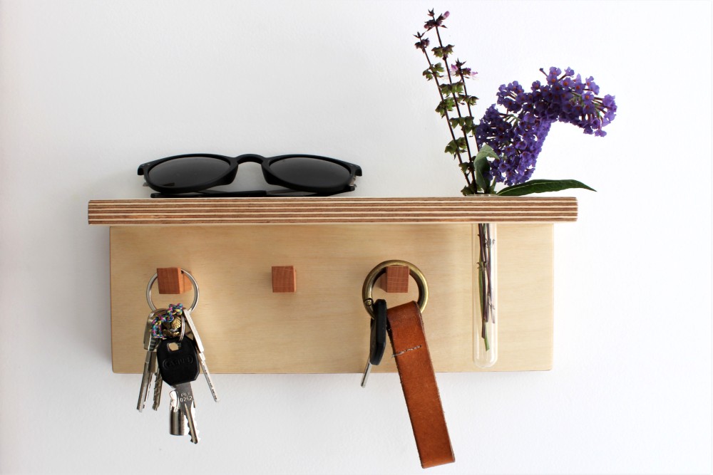Three handmade hooks made out of Cherry wood mounted on a panel of Birch Plywood. The 6 cm wide top surface features a Glass flower vase to display dried or fresh flowers. Finished with Hardwax Oil.