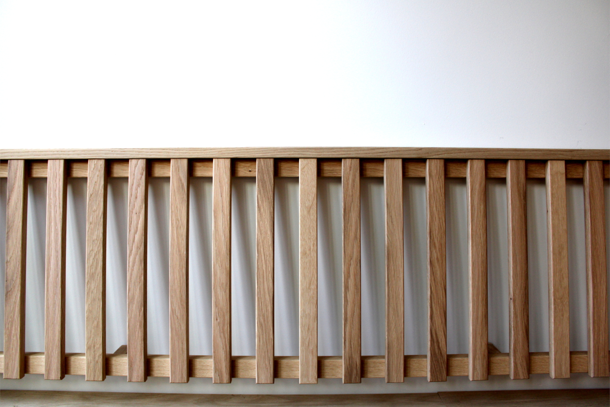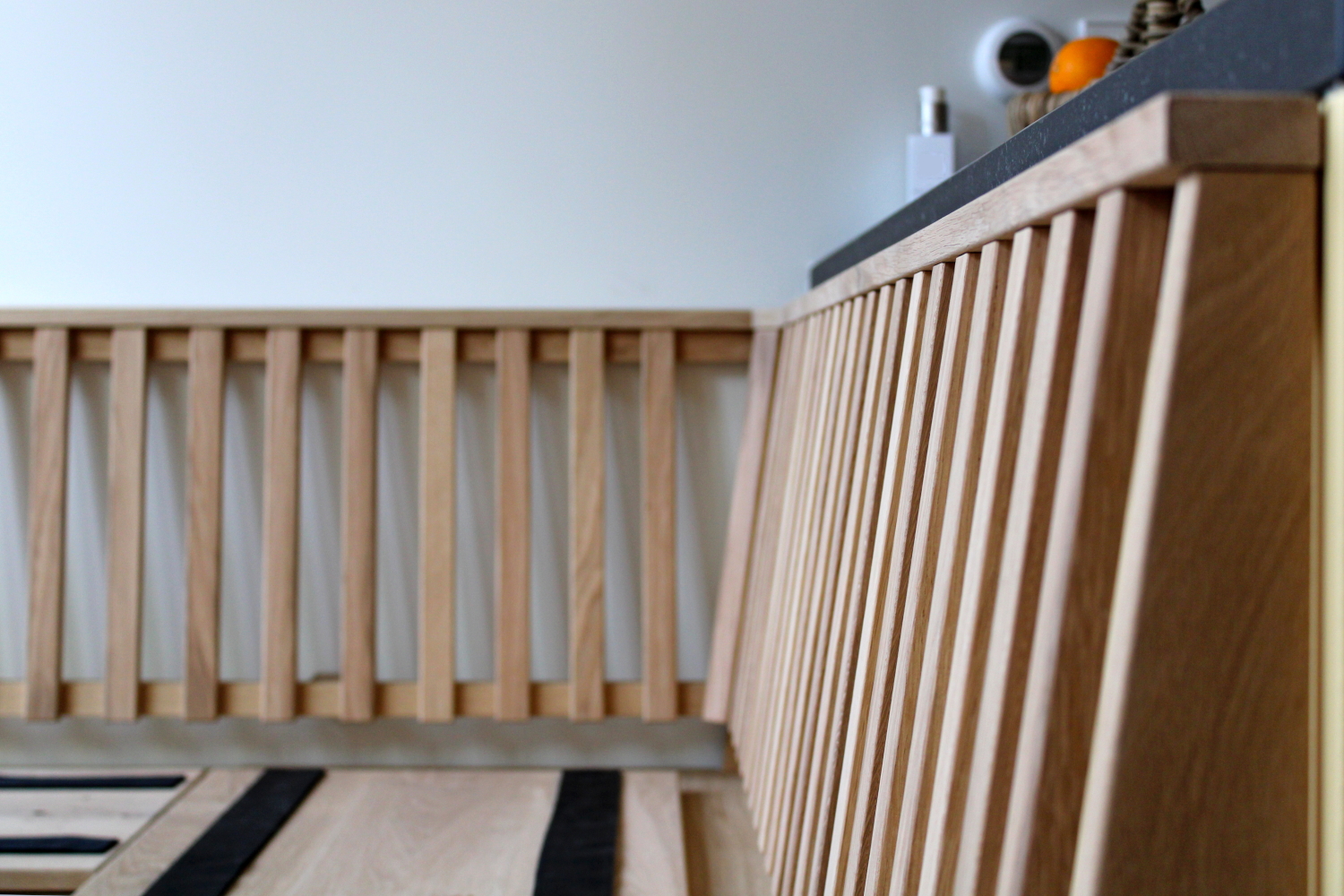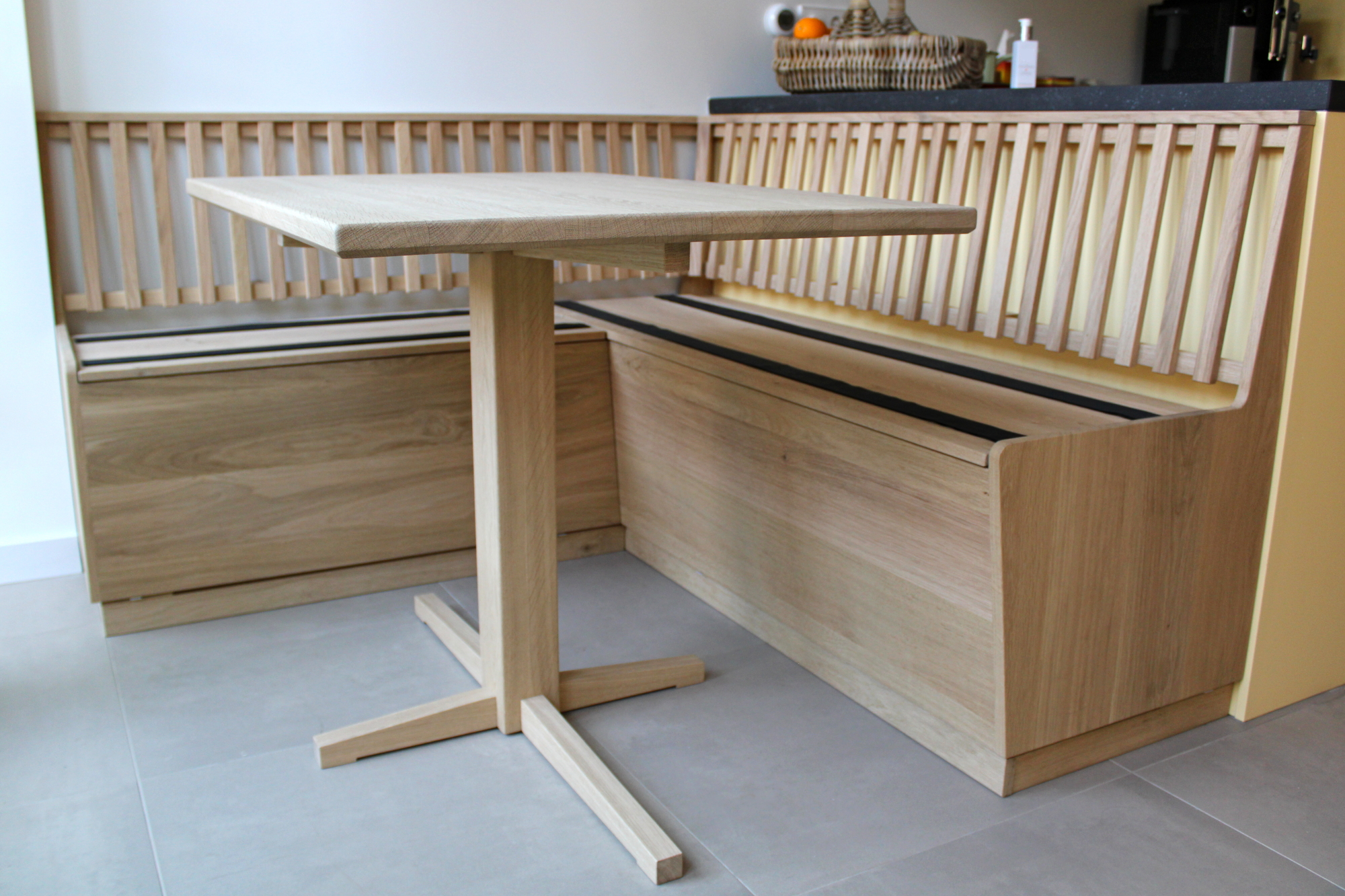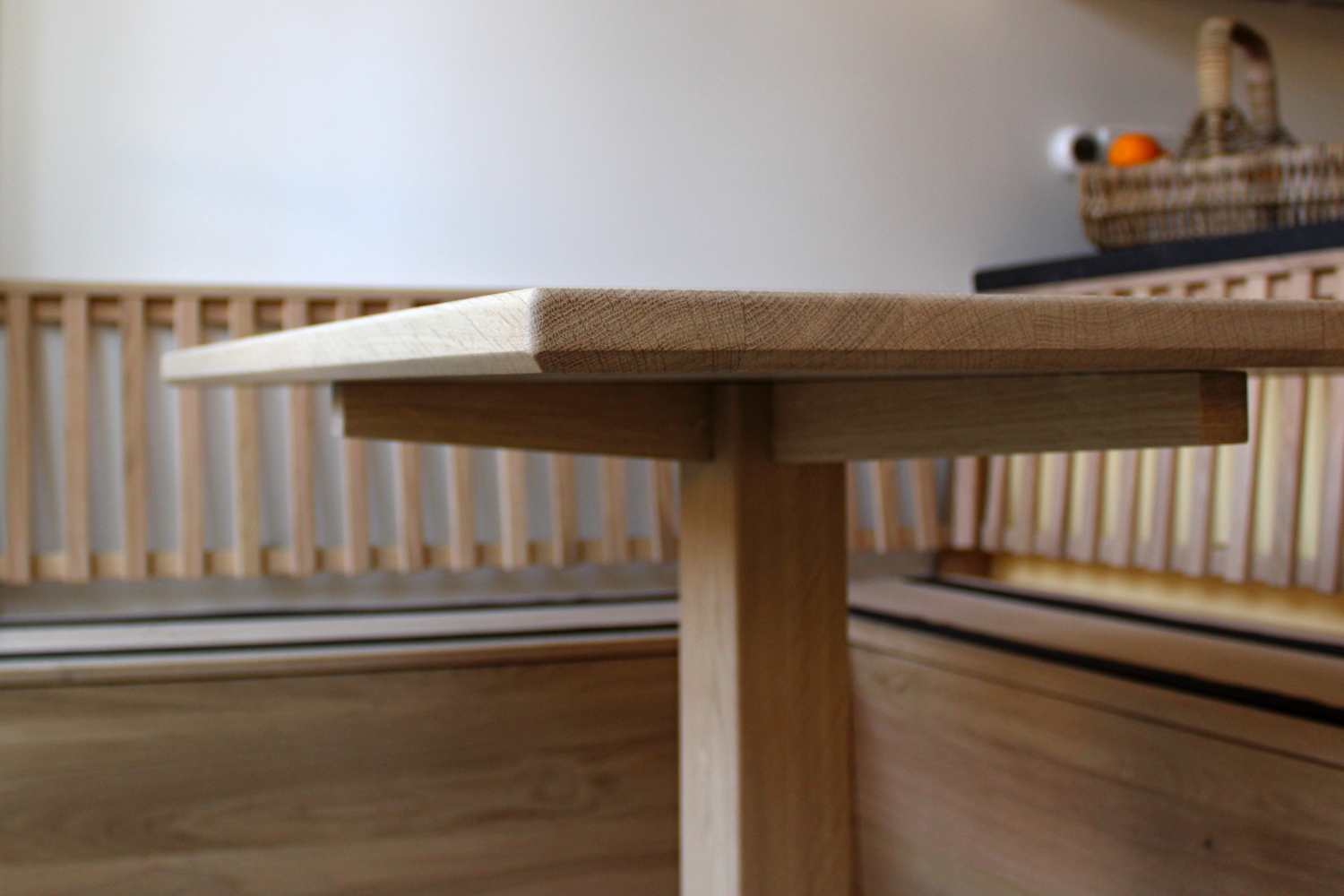 In the design phase, we discussed the choice of wood, the exact details and division of the bench as well as the design for the table. I suggested that we use slats for the back of the bench to create some movement and rhythm, as well as open the boxy nature of the storage bench. The slanted front of the bench leaves enough room for legs and feet while seated, as well making sitting down and getting up easier. The storage under the seat can be accessed by simply lifting the seating.