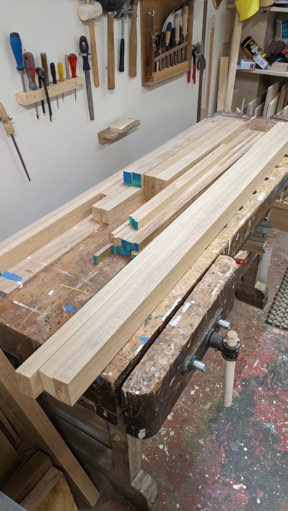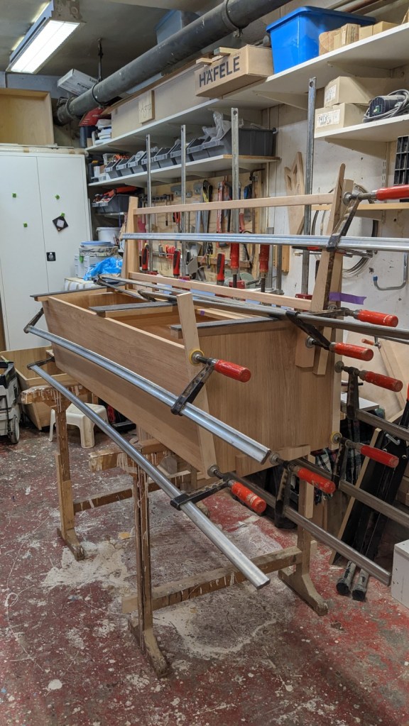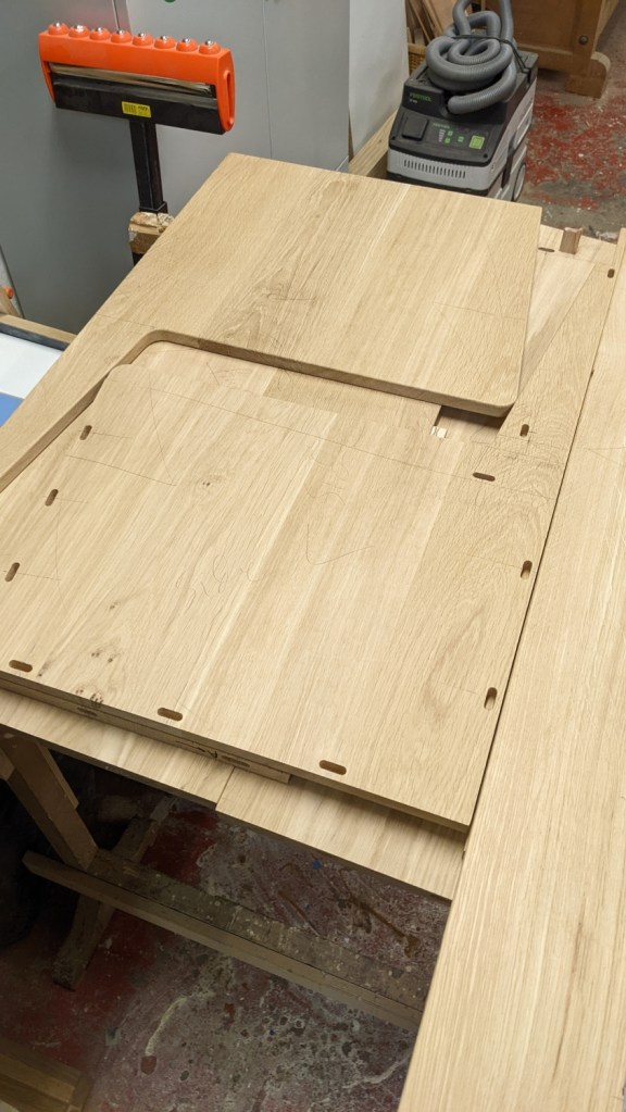 The build of these three elements took close to three weeks and was challenging in many ways. I started by making the two bench elements which are made from prefabricated solid wood oak panels; cutting the angles on the pieces, shaping the outer sides with its curves, and routing all the dominos as connectors. I then finished the components from the inside with 2k lacquer before I glued them up. Lastly I added the slats as the backrest.