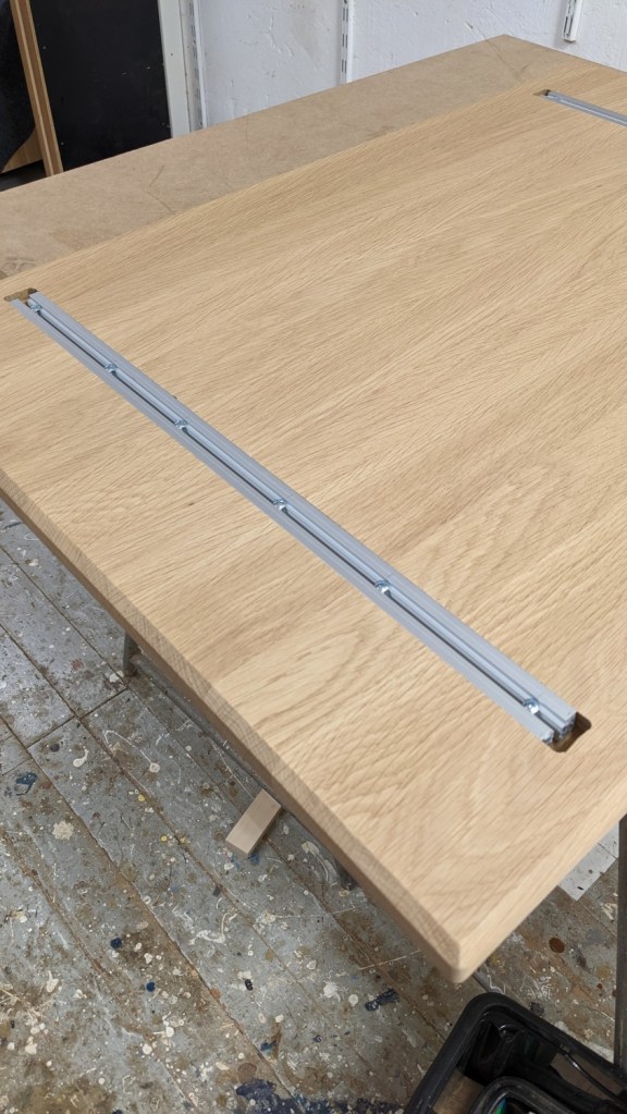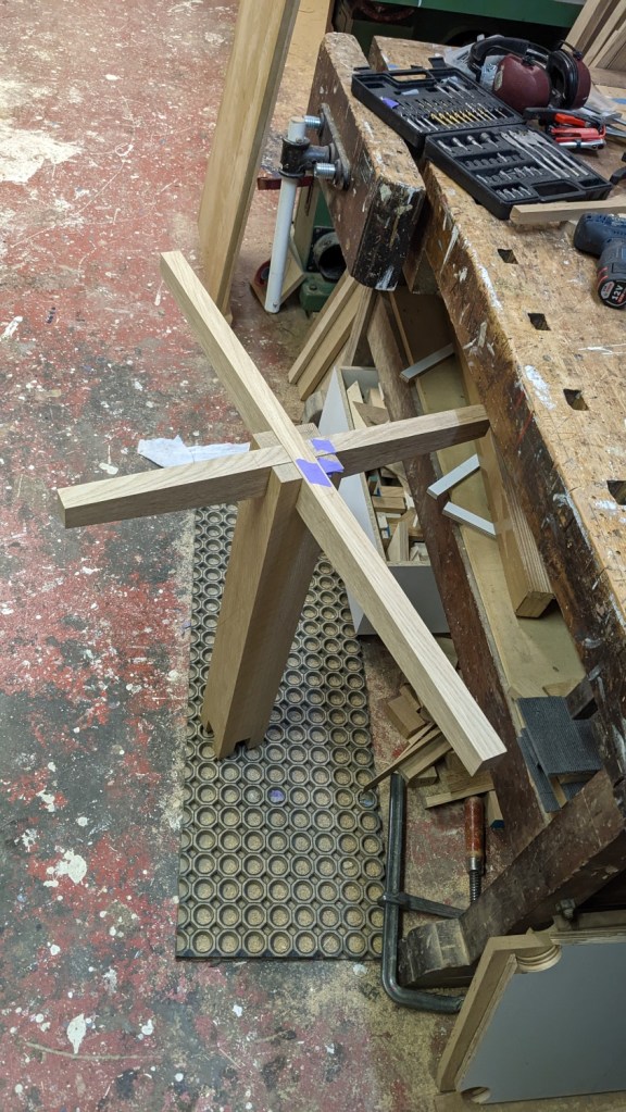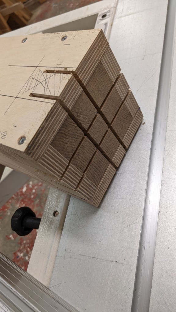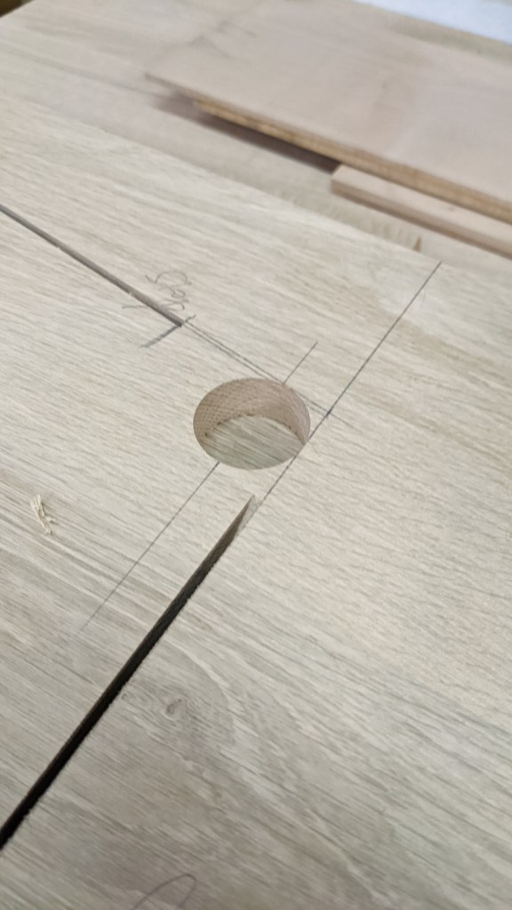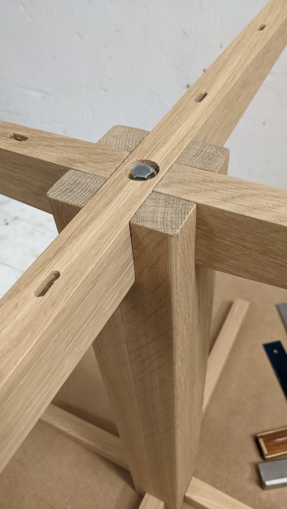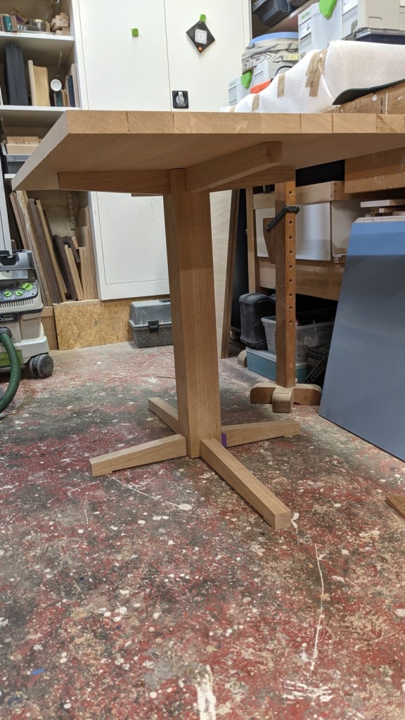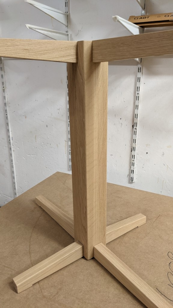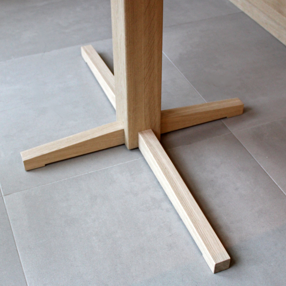 The pedestal dining table is made from solid european oak lumber. I roughly ripped and planed the slabs a week in advance to allow the wood to acclimatize before planing it to final thickness. Certain woodworking rules were considered while gluing up the 30mm table top to avoid warping over time. I even routed in a stabilising dovetail profile to make sure it stays flat while allowing it to expand and contract freely. The joinery for the table base was done on the table saw using a jig and then refined using handtools.