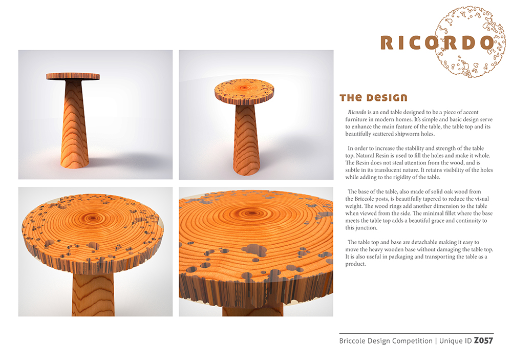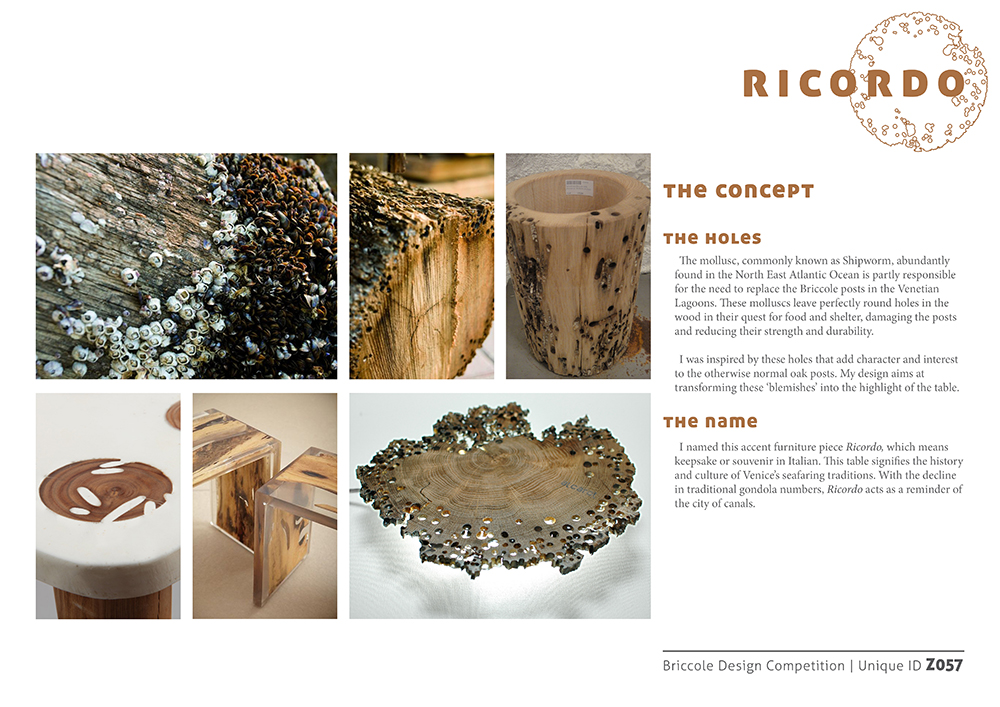 The Zolijns Riva 1920 Briccole Design Competition was held in India, with over 150 entries from 6 design colleges. The brief was to re-use the Briccole posts from the Venetian lagoons and design a table out of them. The Oak posts get worn out by tiny molluscs that live in the water and need to be replaced periodically. This competition was an attempt to find a new use for them in the furniture industry.