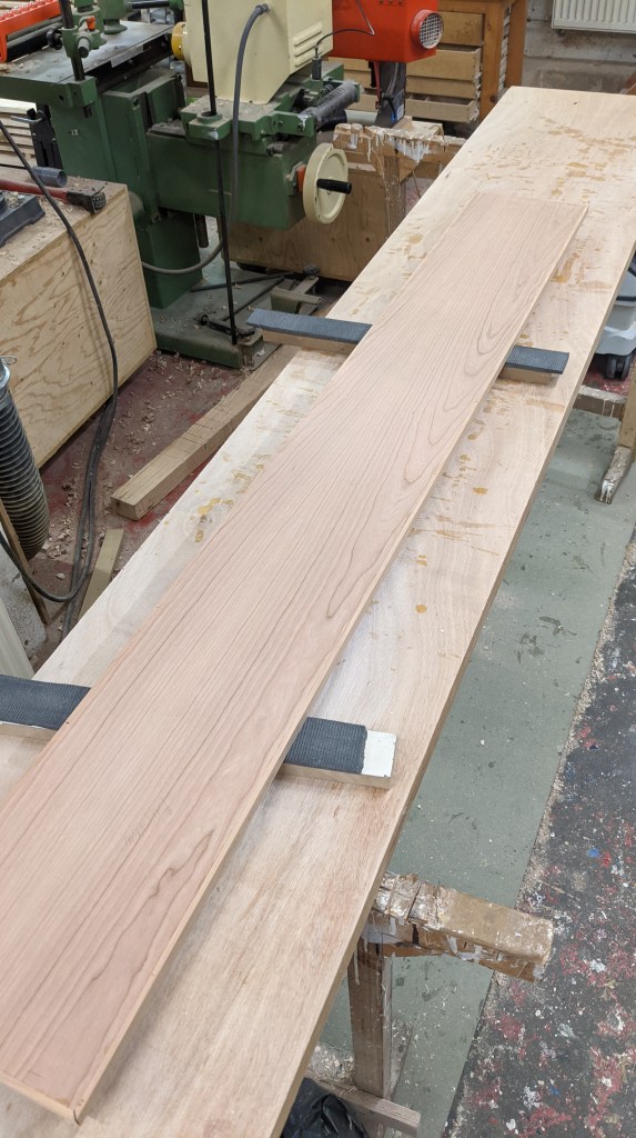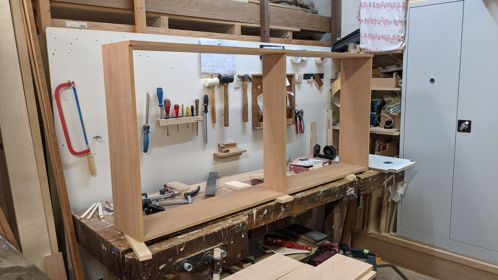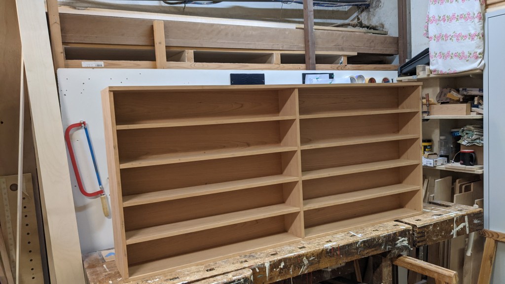 The top of the shelf is deep enough to seat the client’s CD player. The entire shelf is assembled using Clamex fasteners and can be dismantled for ease of transport during moving. It is finished with two coats of natural Oil-wax finish.