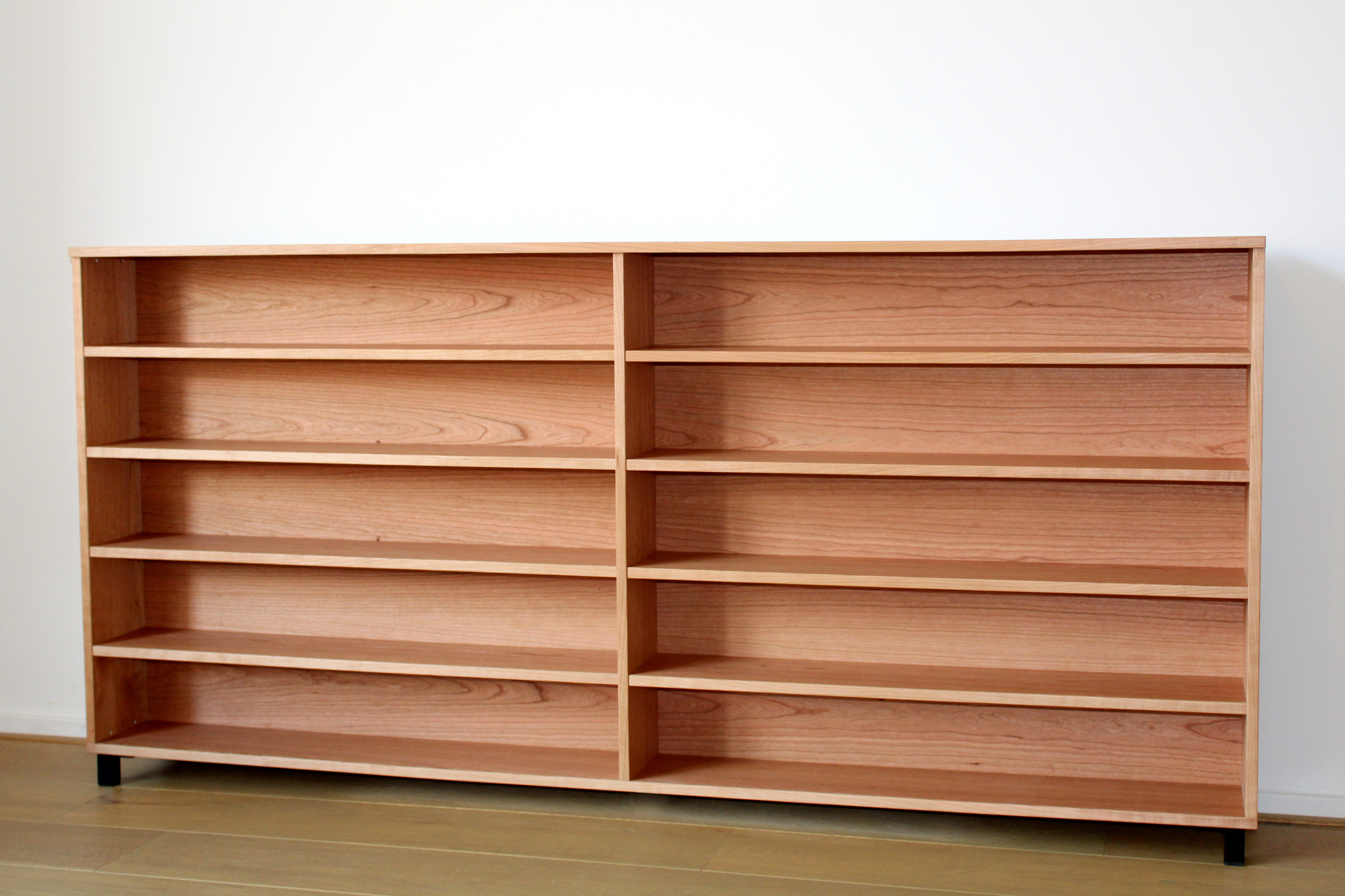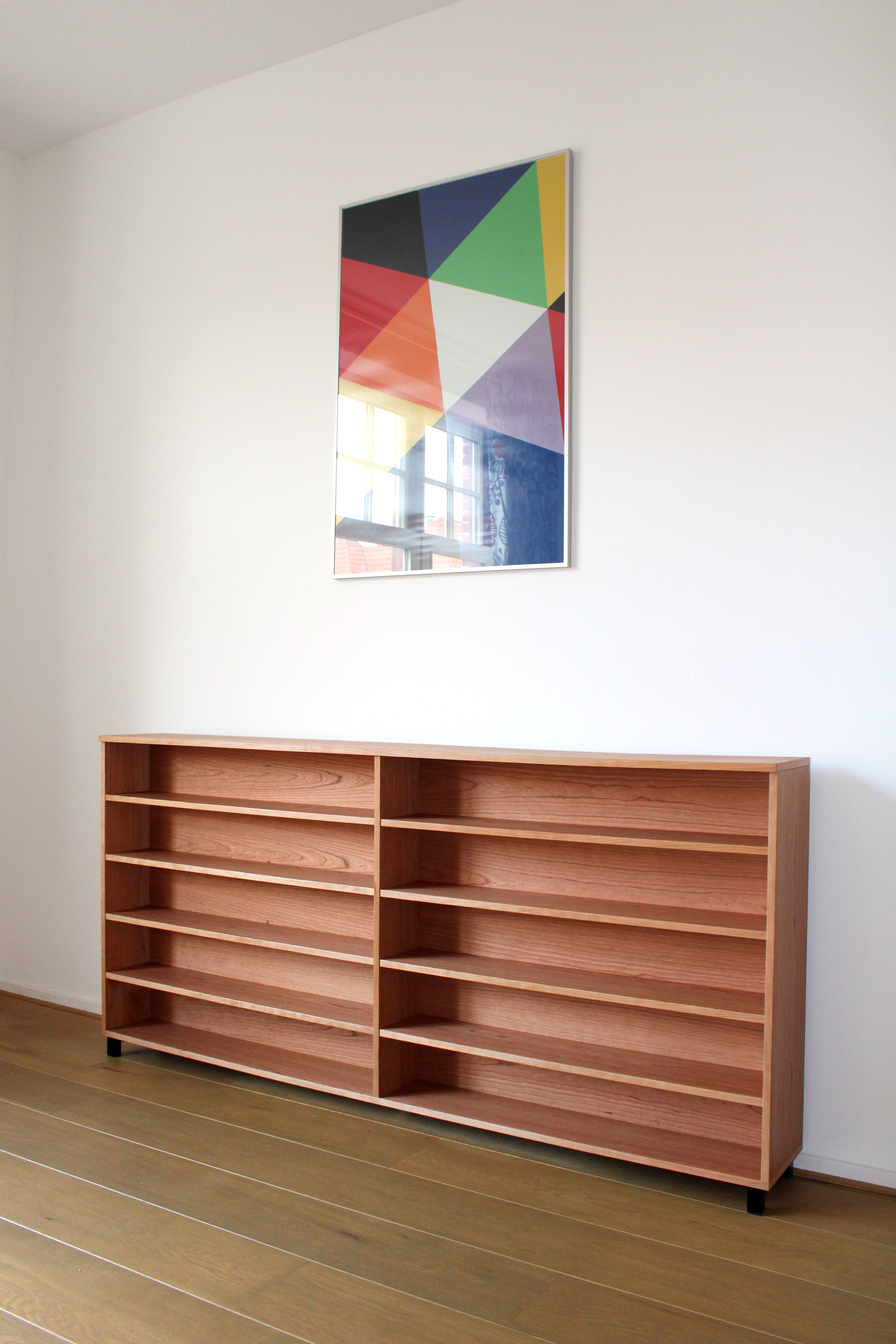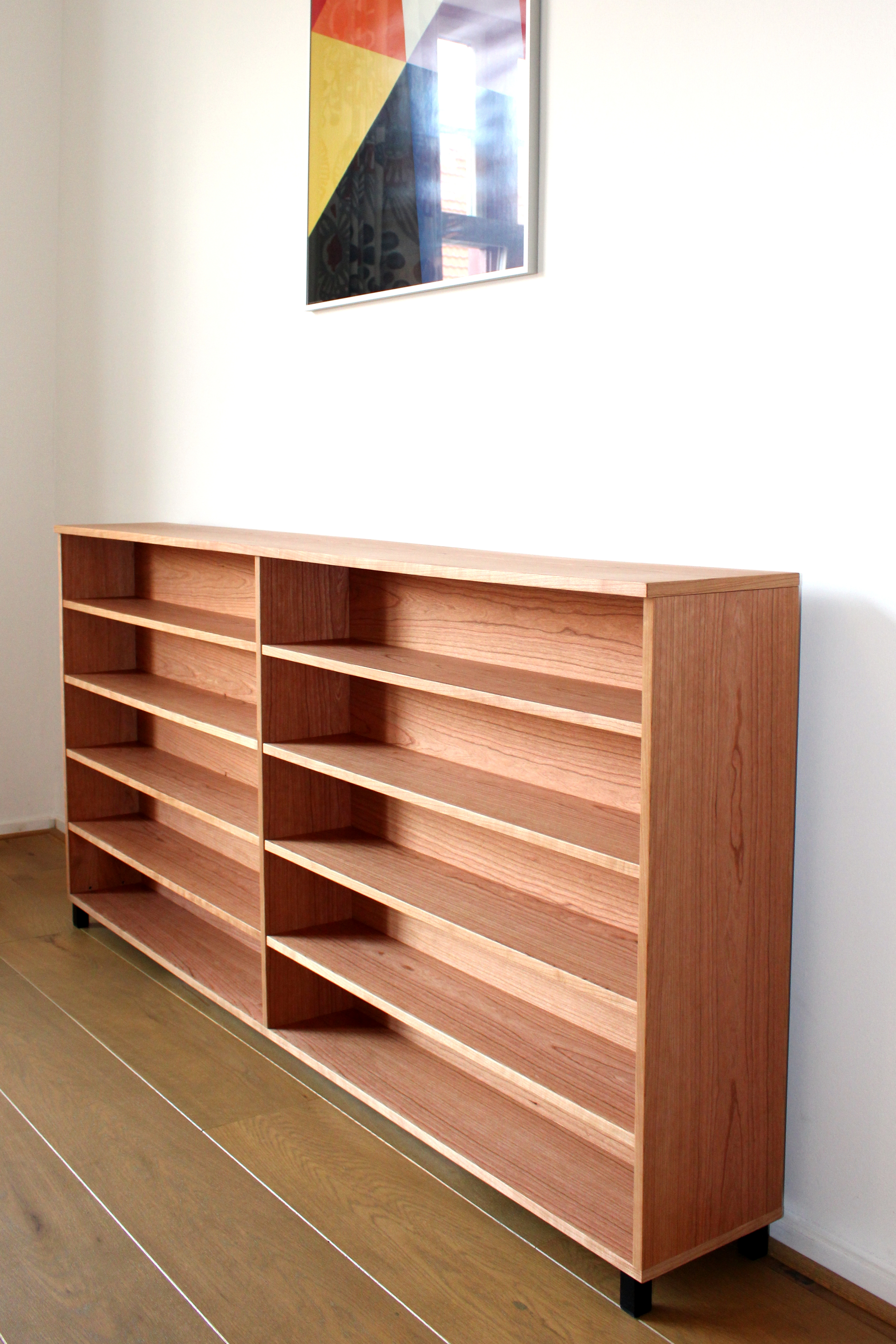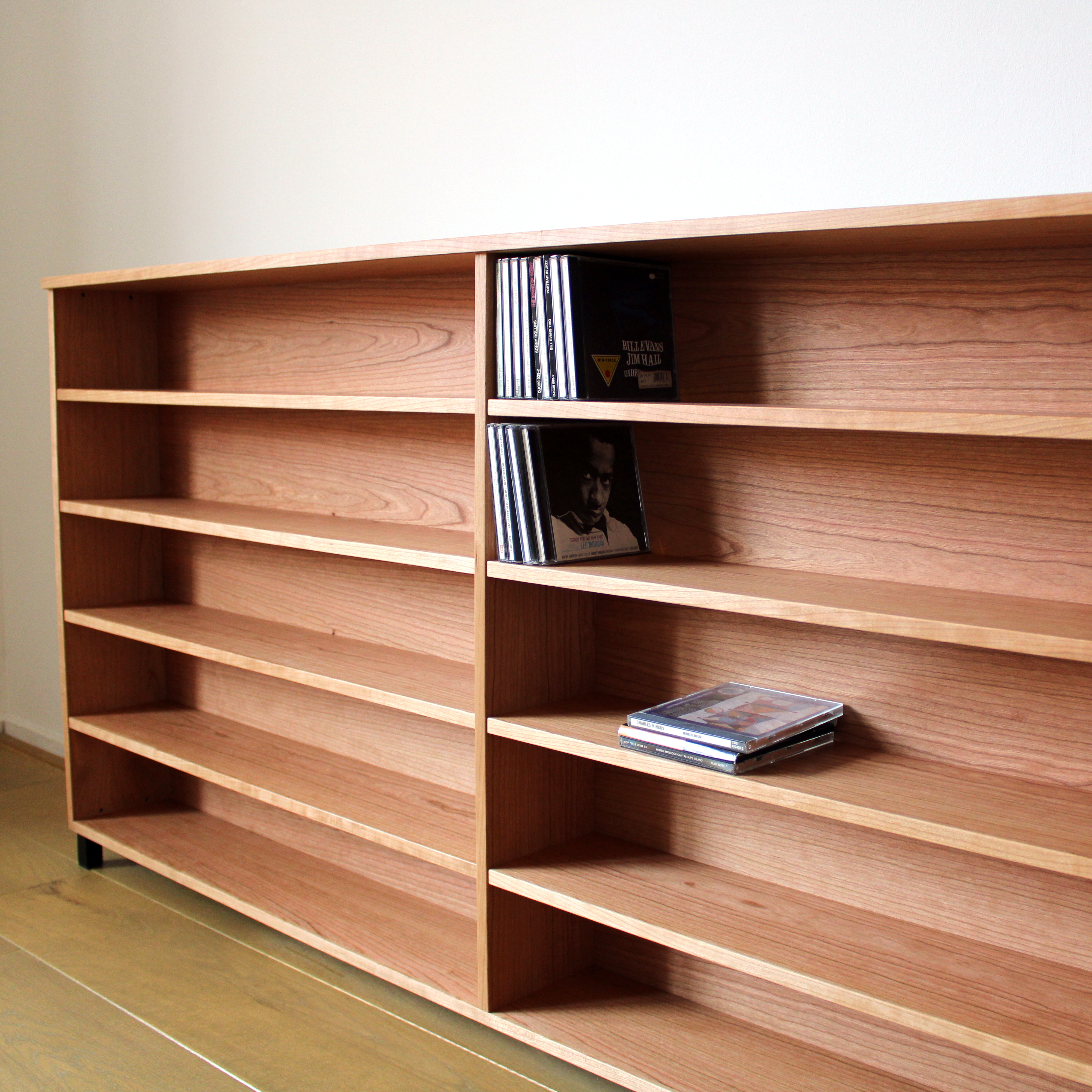 The client wished to have an elegant storage solution for his extensive CD collection and CD player. In keeping with the style and wooden finishes of other furniture in his living room, American cherry veneer on plywood was chosen. The edges of the plywood are clad with solid cherry edge banding, mitred around the corners. Classic black metal legs complement the mid-century feel of the cabinet while slightly raising it off the floor.