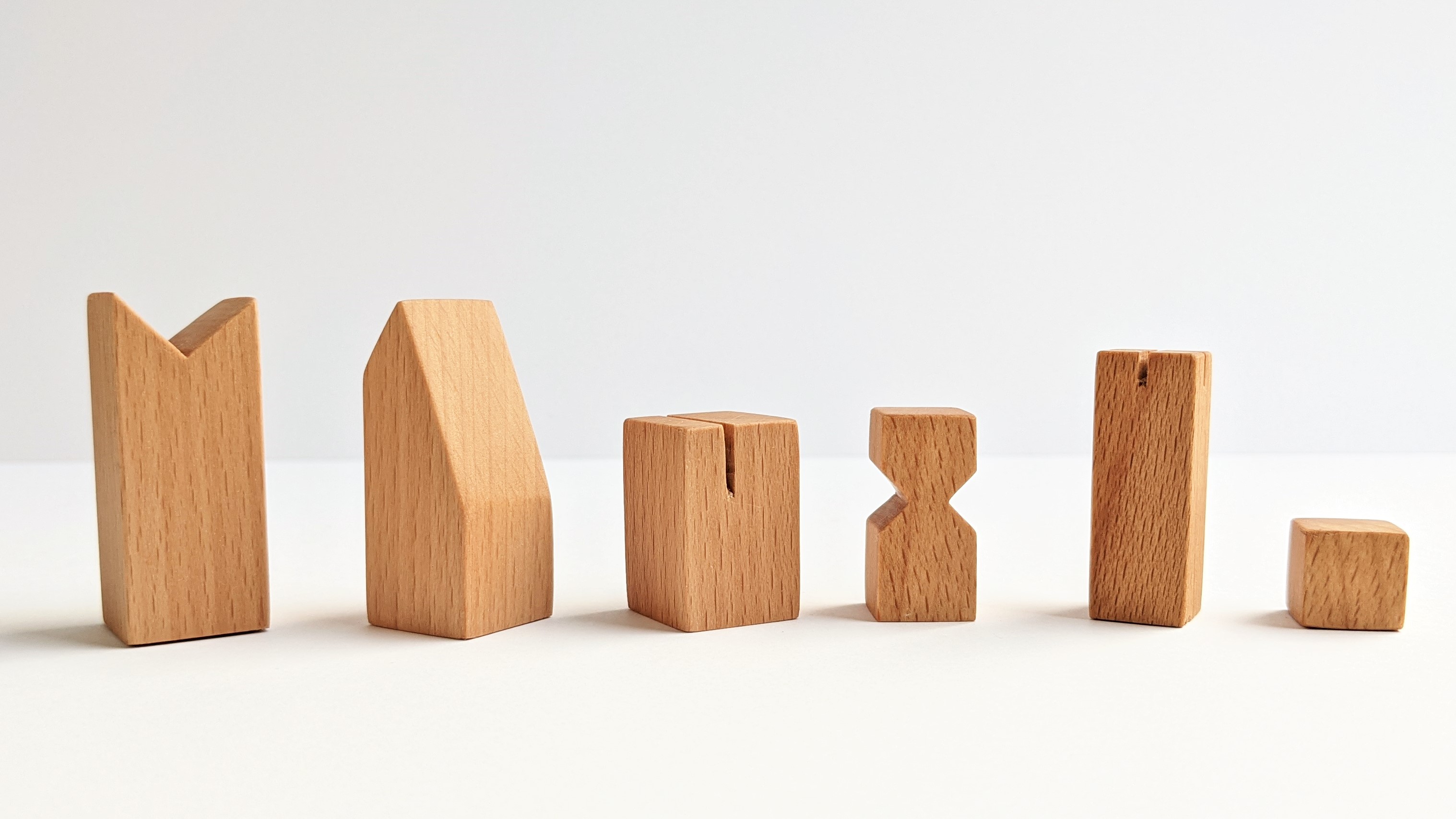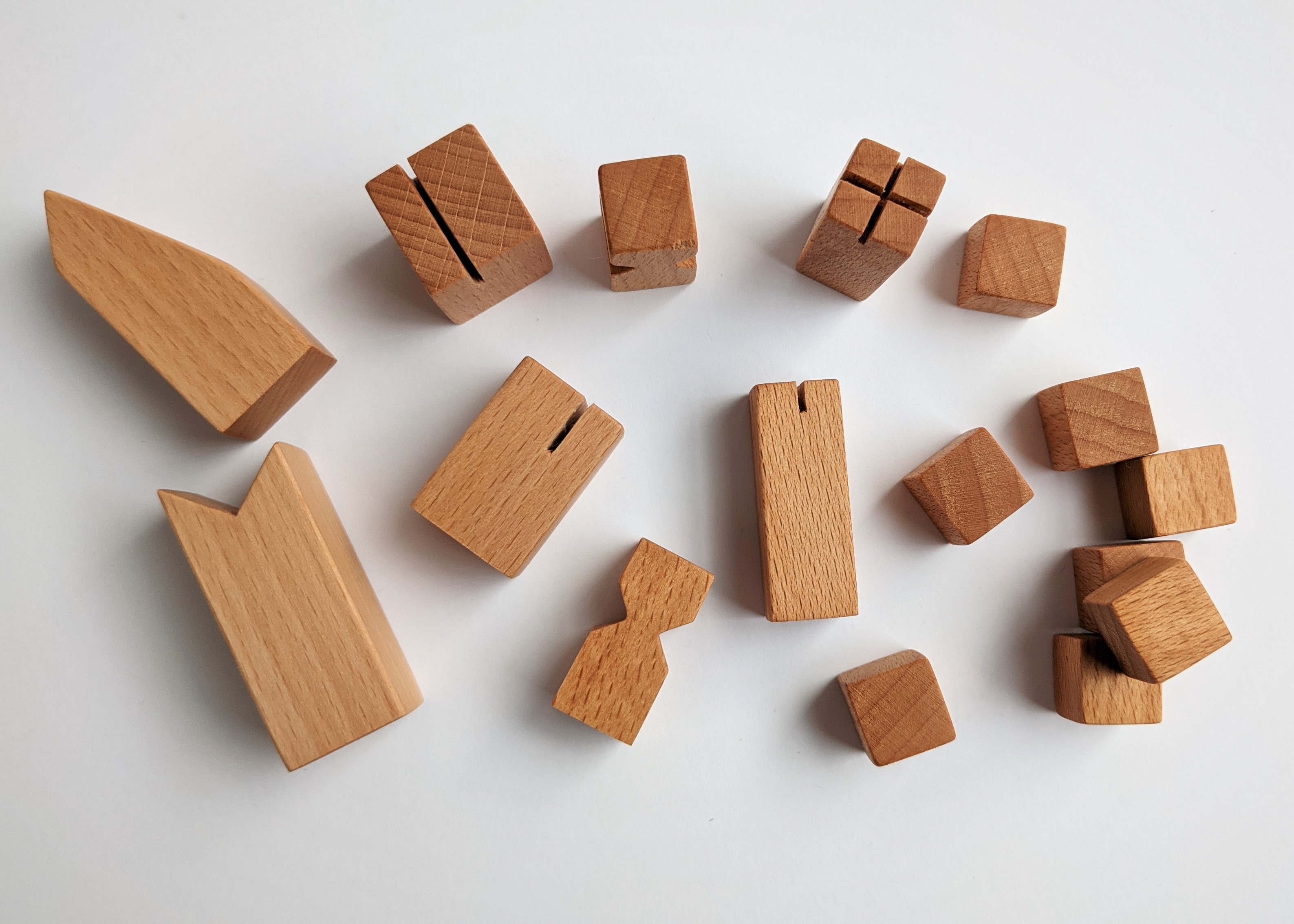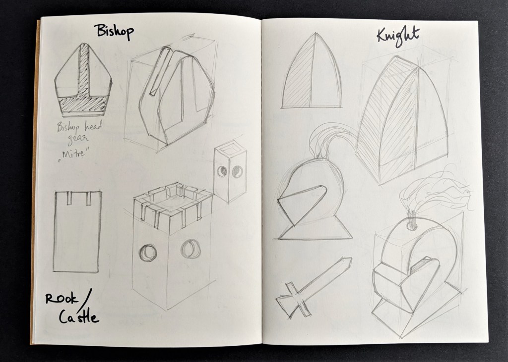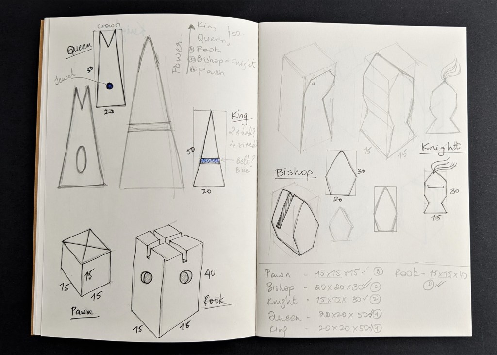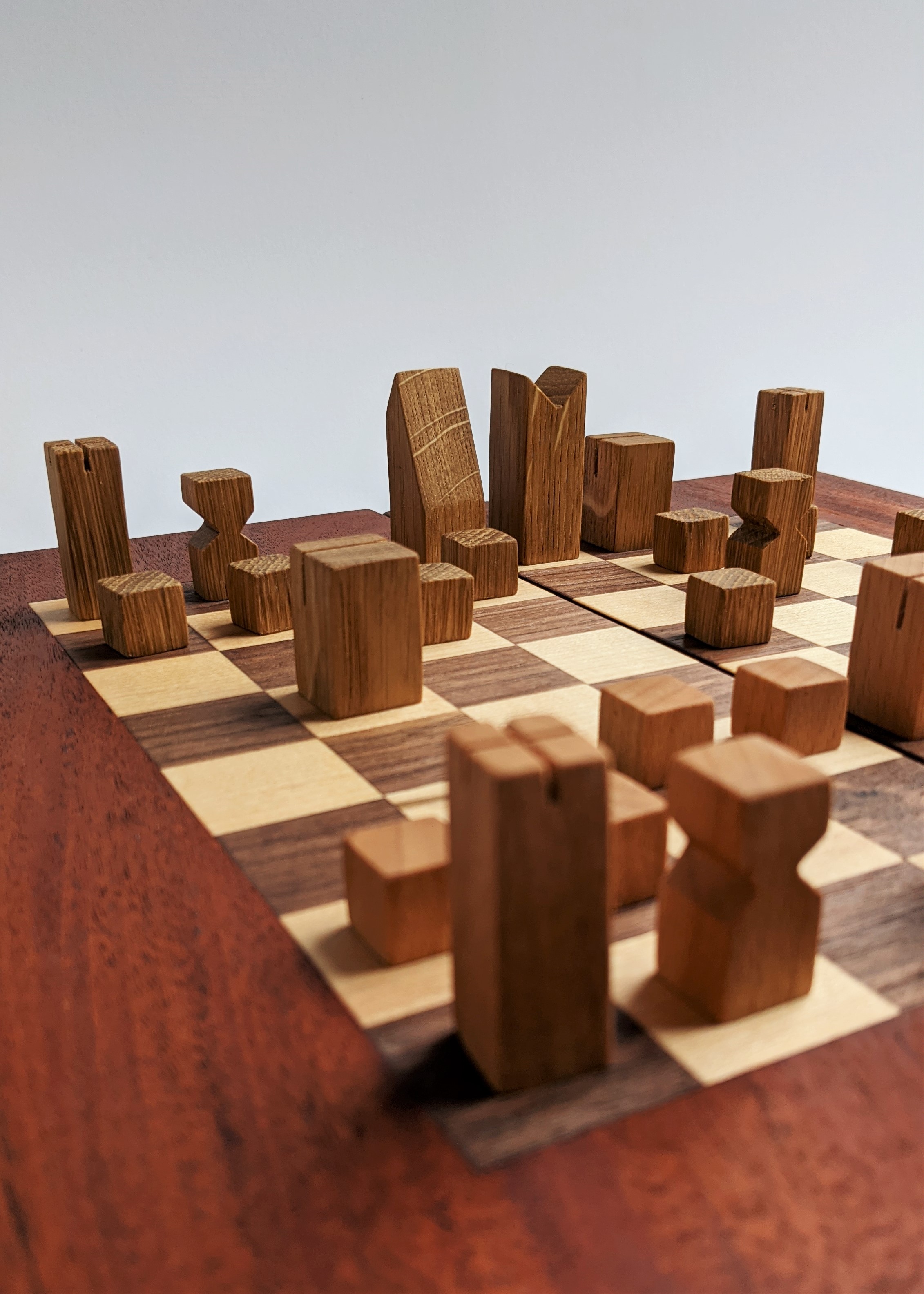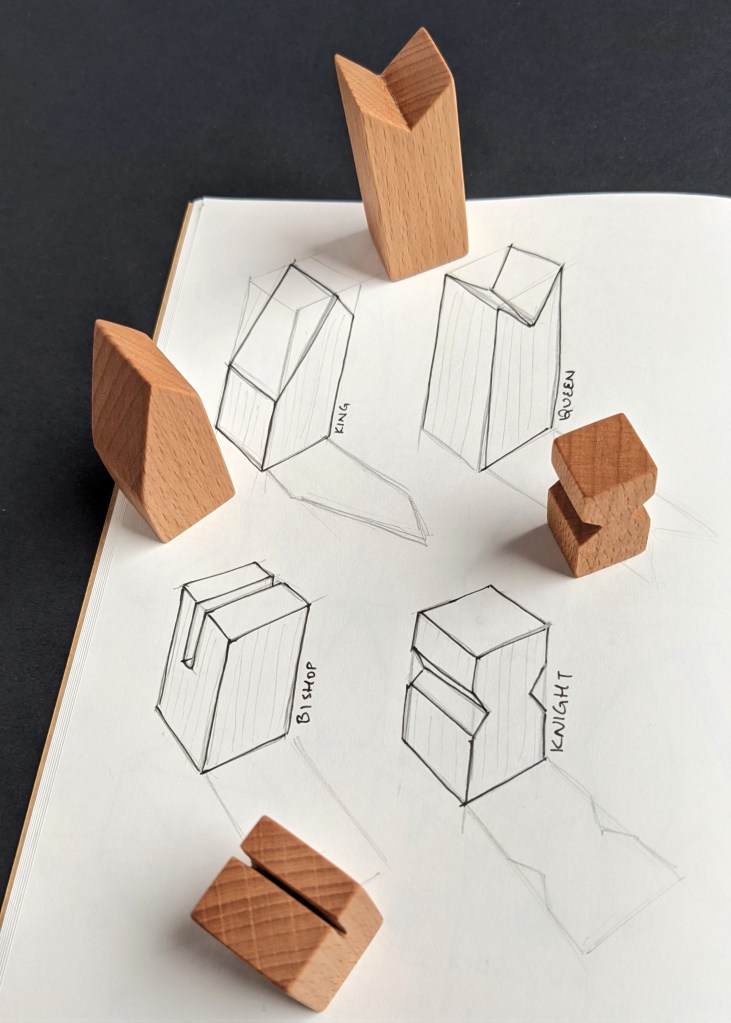 The pieces are completely hand made and were designed after an initial research on symbolism and design language of traditional wooden chess pieces. I simplified the pieces and to give them a modern, minimalist look, while making sure that their function remains recognisable. I used Oak wood for the black and Beech wood for the white pieces.