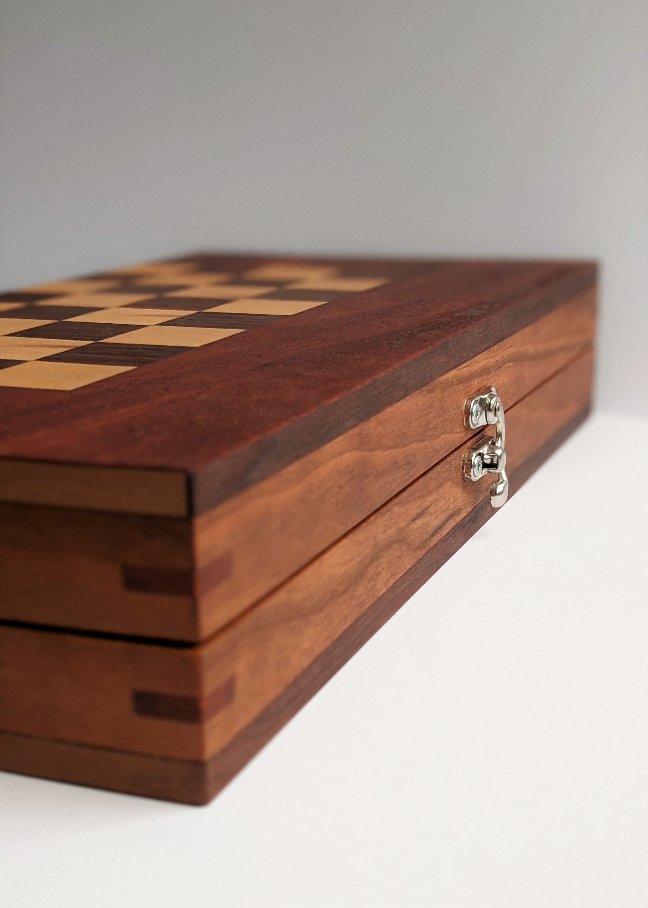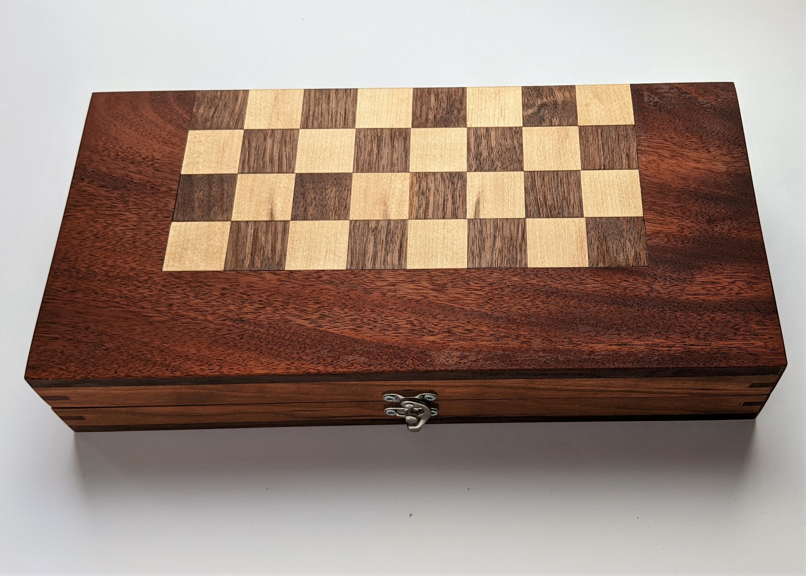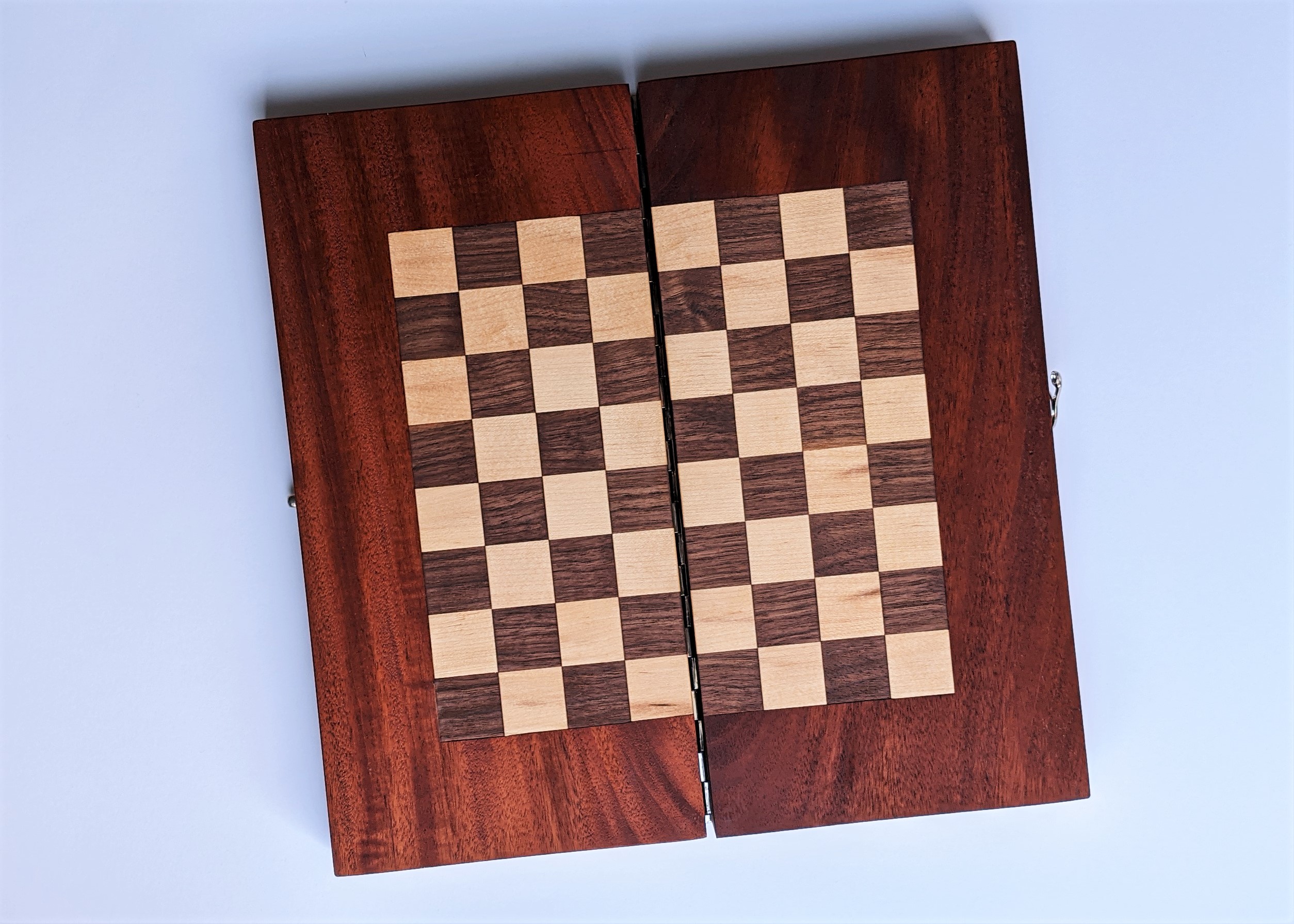 The playing surface is made using the Marquetry technique with Padouk, Walnut and Maple veneer and is glued onto a Walnut frame. Hinges and a clasp were fitted onto the two halves of the box so that it can be closed securely. The inside of the box shows a burl veneer.