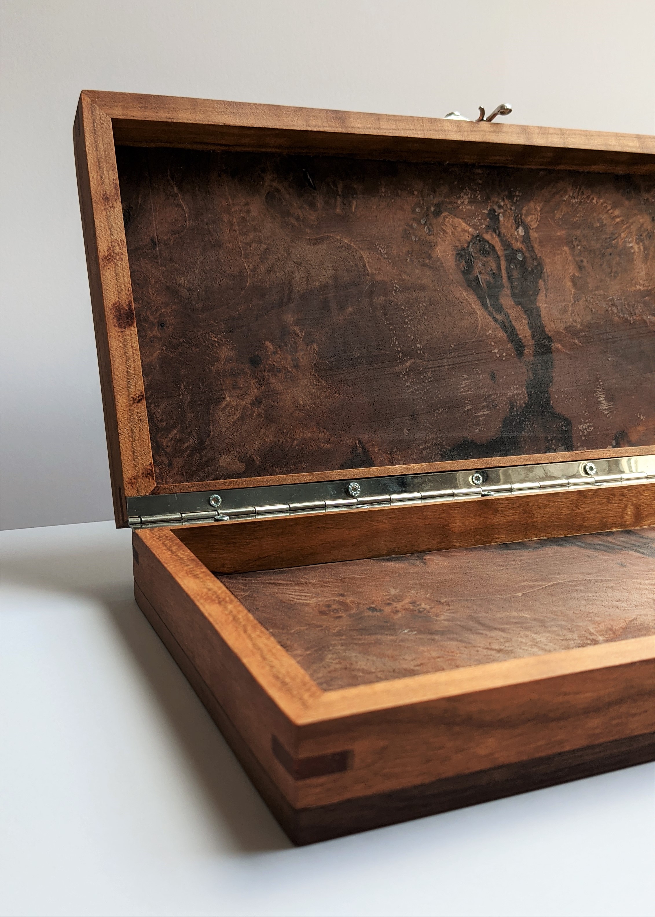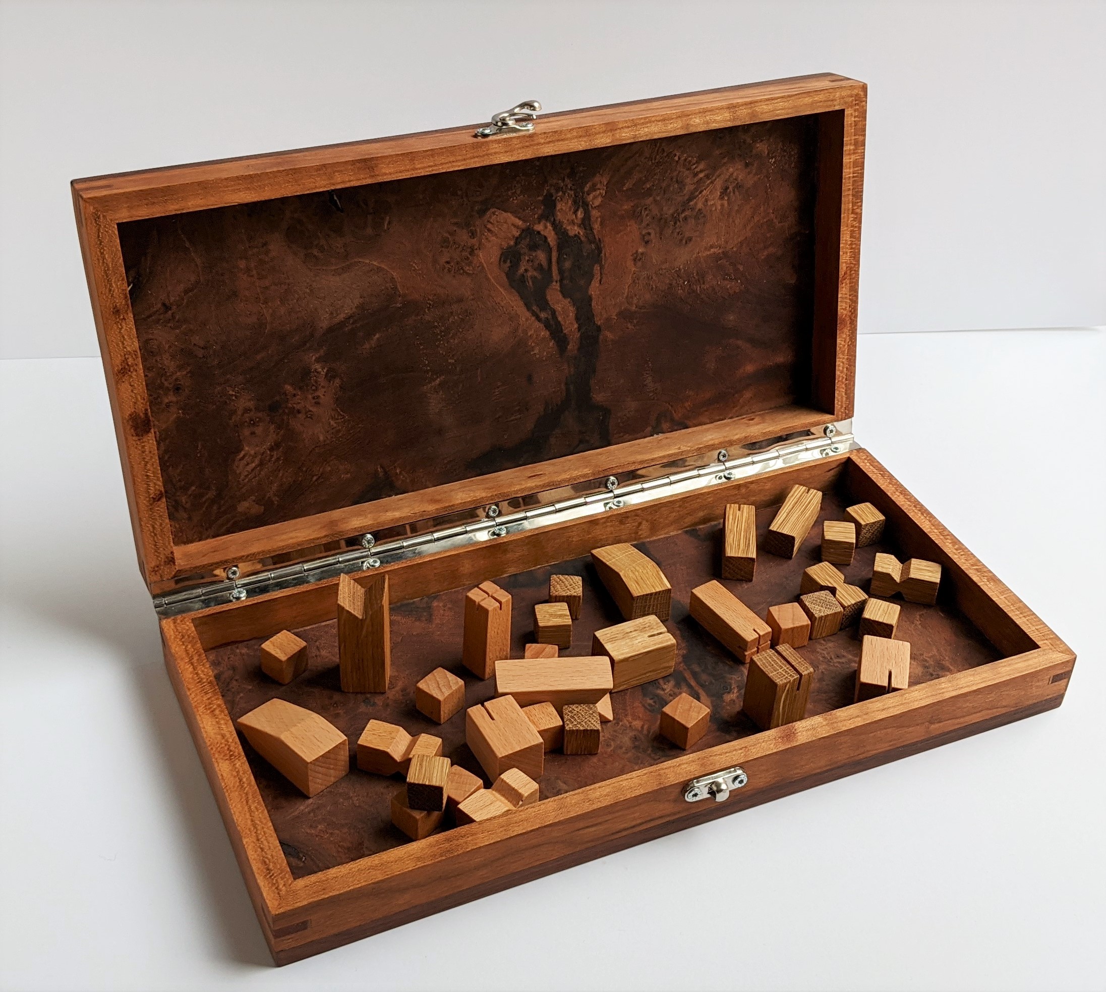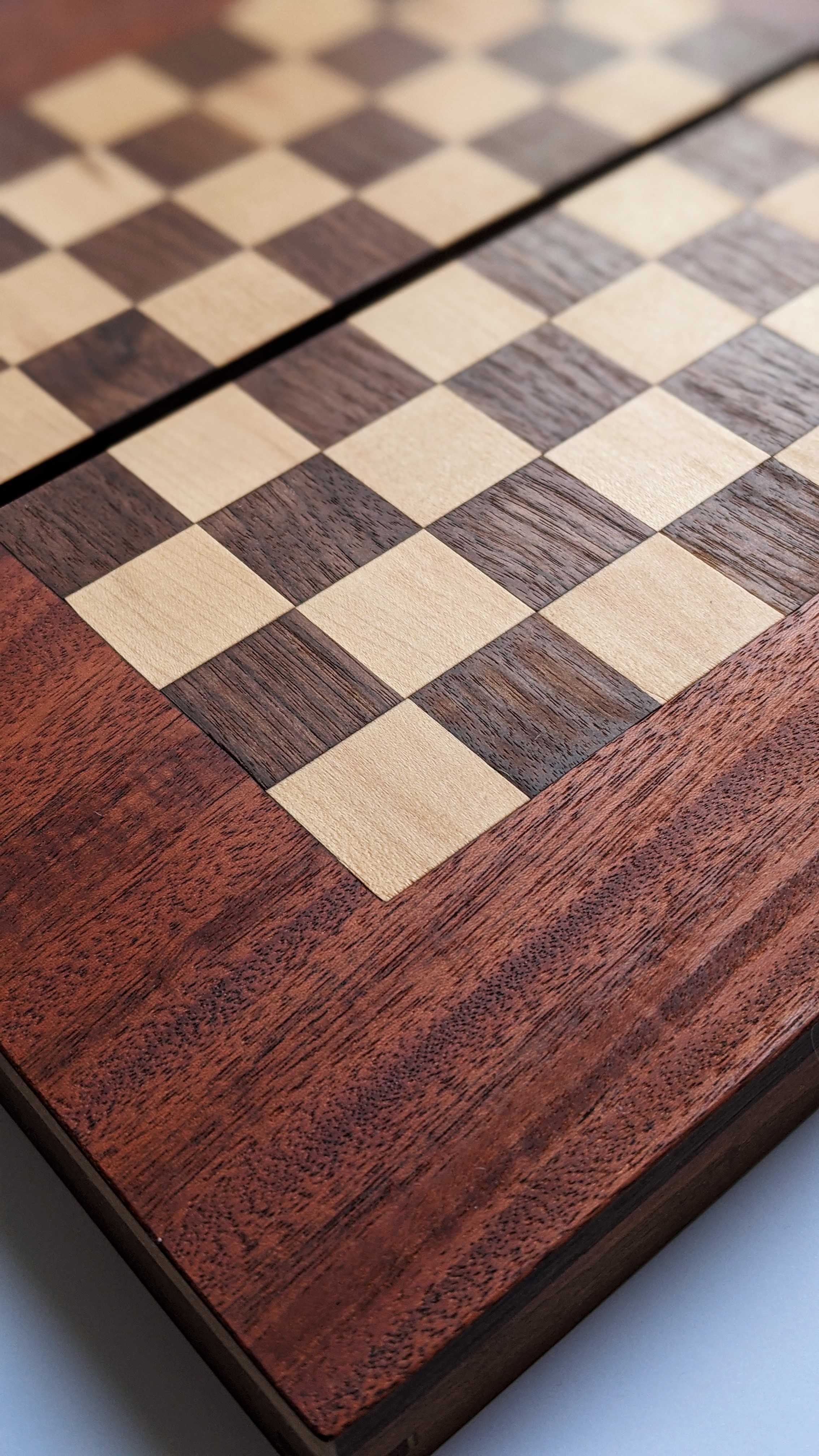 The playing surface is made using the Marquetry technique with Padouk, Walnut and Maple veneer and is glued onto a Walnut frame. Hinges and a clasp were fitted onto the two halves of the box so that it can be closed securely. The inside of the box shows a burl veneer.