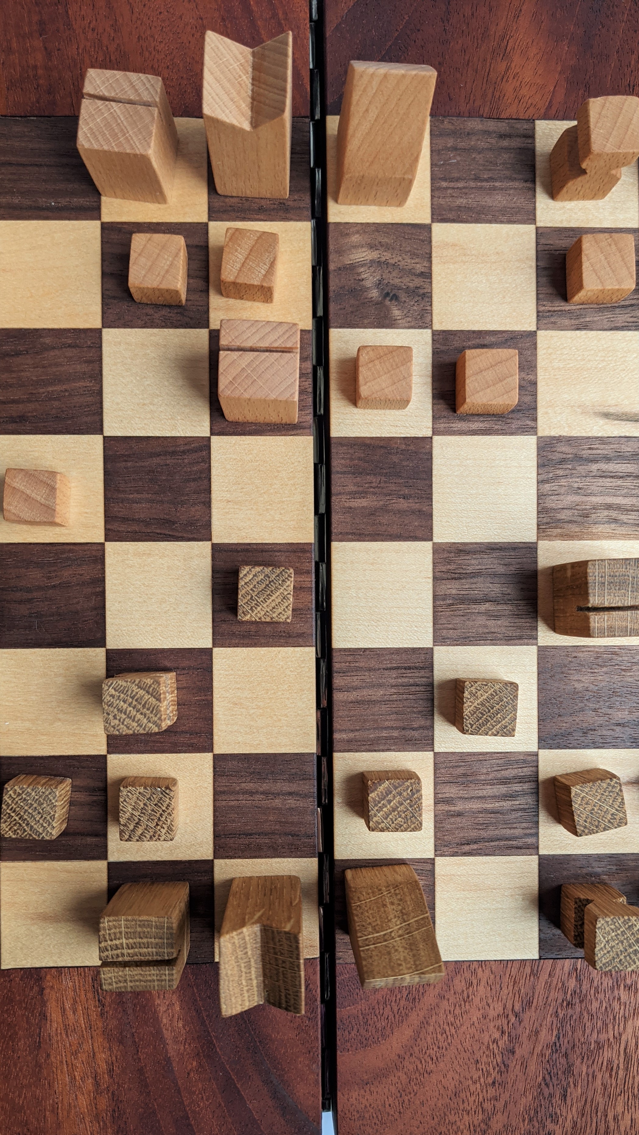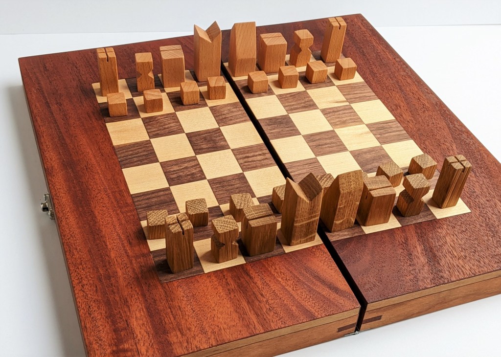 This set of 32 chess pieces and box style chess board was created in two phases. The board itself was made during my carpentry apprenticeship, and the chess pieces were made later to enable the usage of this beautiful board.