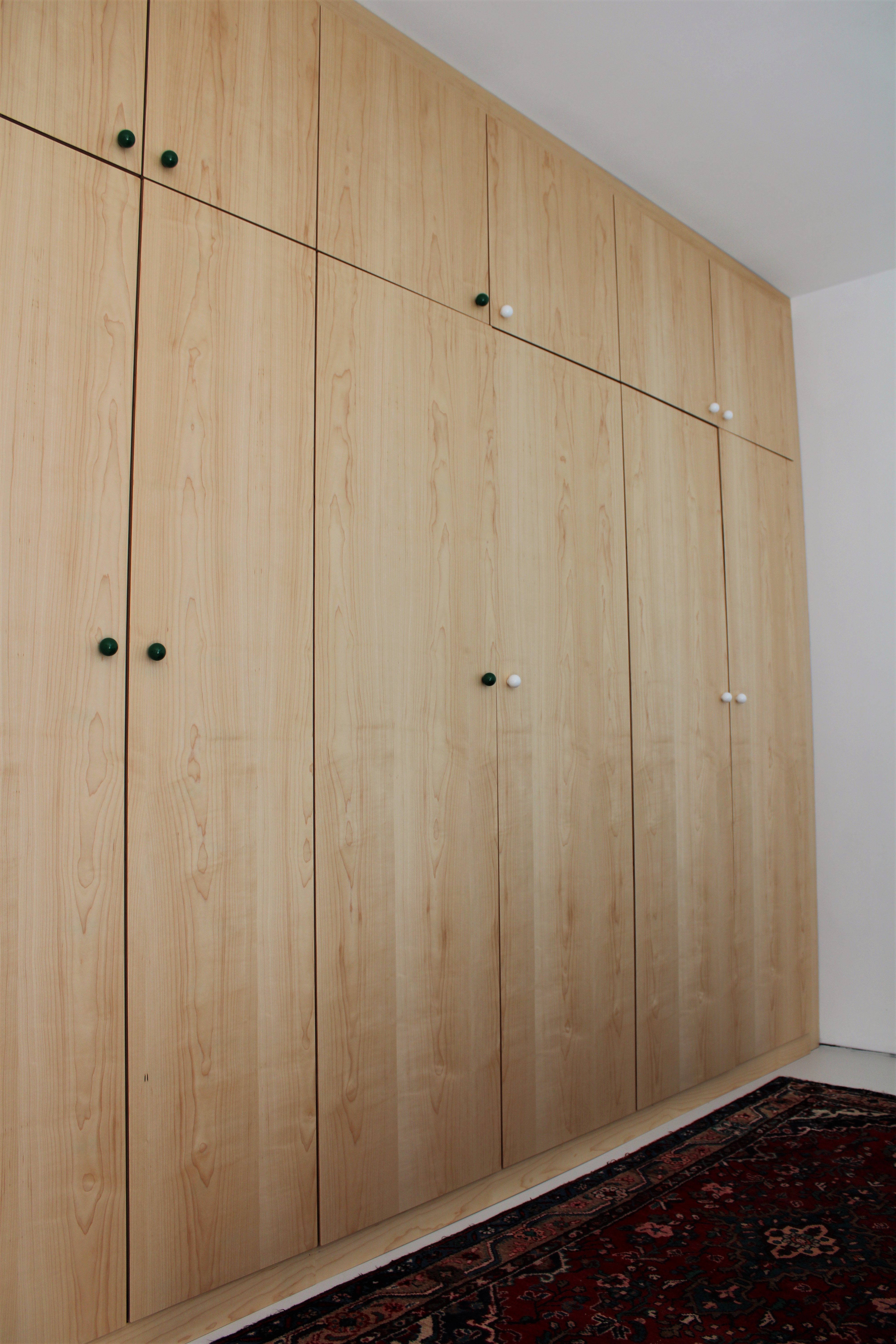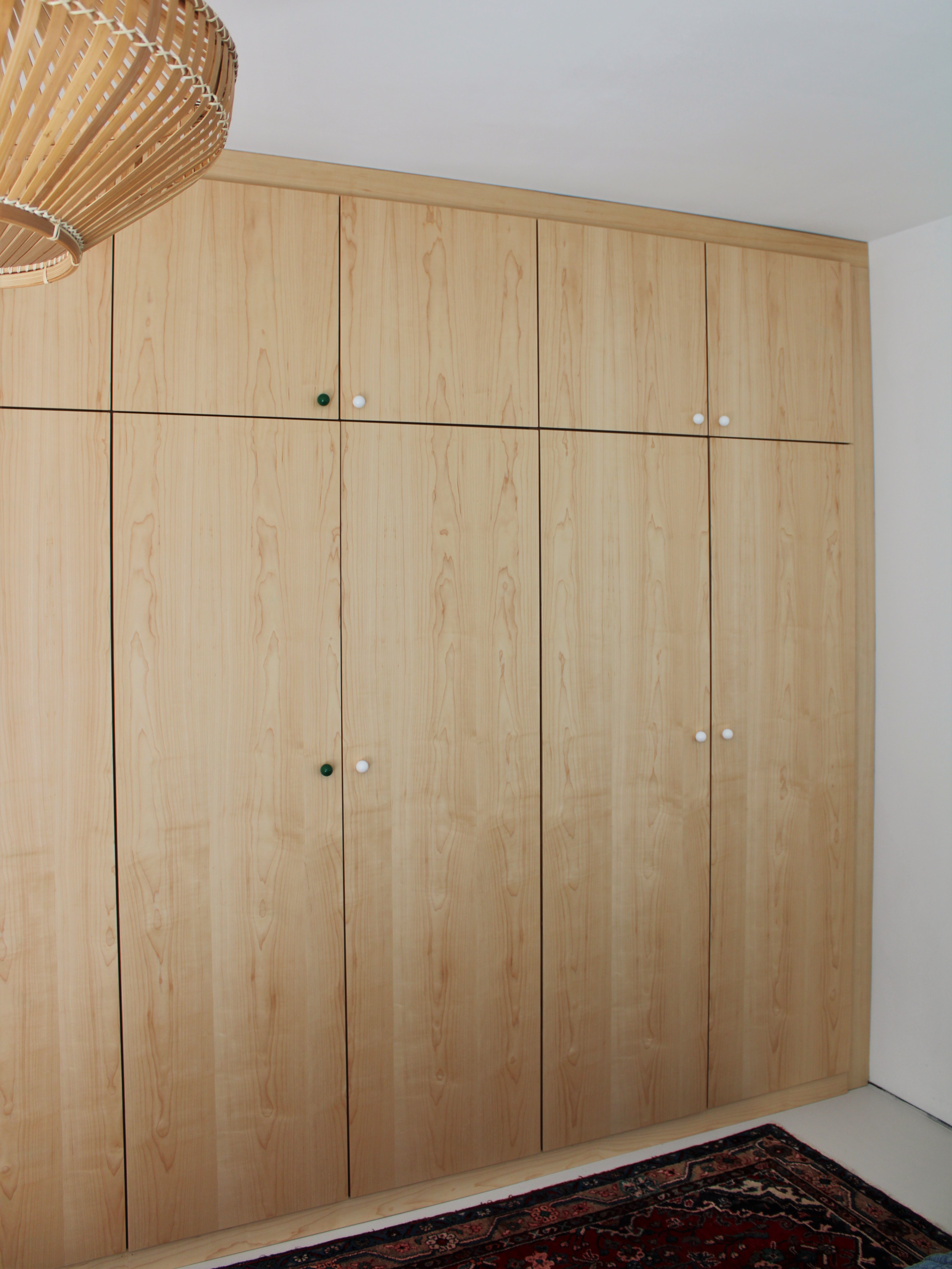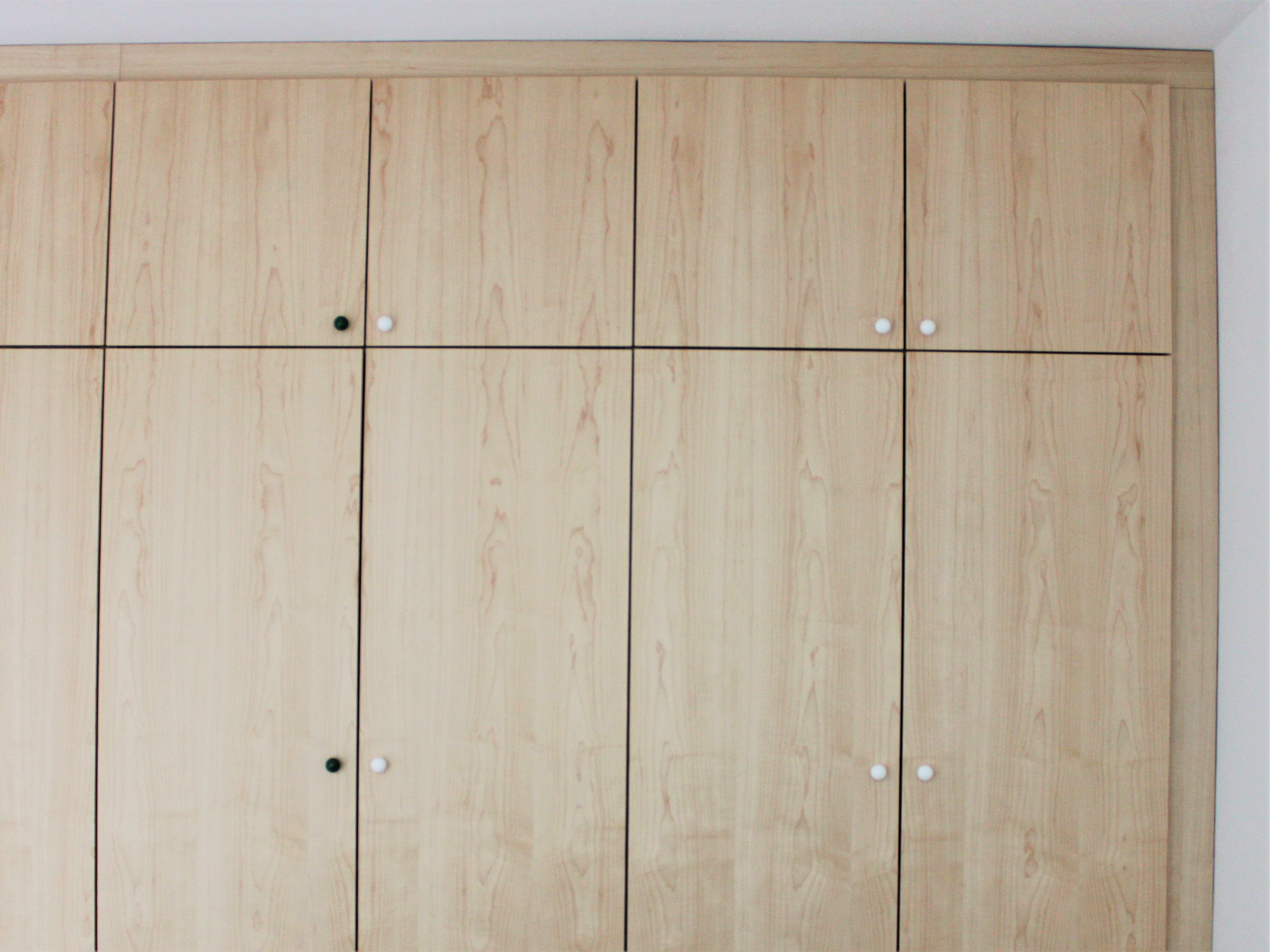 The client wanted a light coloured wood to brighten up the relatively dark bedroom which did not receive much sunlight. Maple with an oiled satin finish was chosen since it would also reflect any sunlight coming in through the balcony doors opposite. The wardrobe doors were split in half while taking care to maintain the continuous flow of the grain in each vertical panel. The veneer for all five wardrobes was sourced from the same tree to give the entire wall of doors a holistic look. The beautiful grain adds movement and life to the otherwise simple design of the doors.