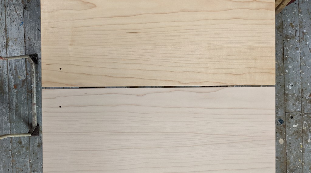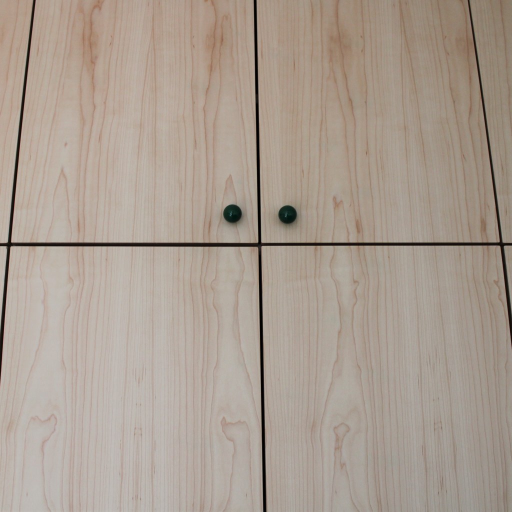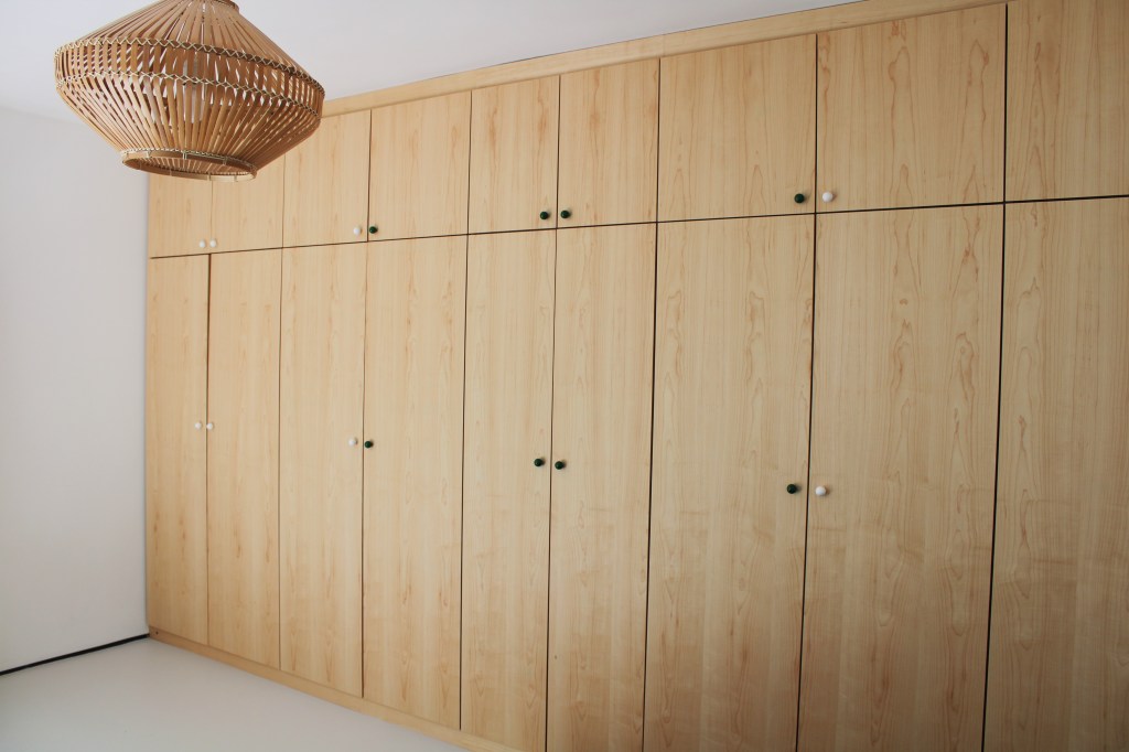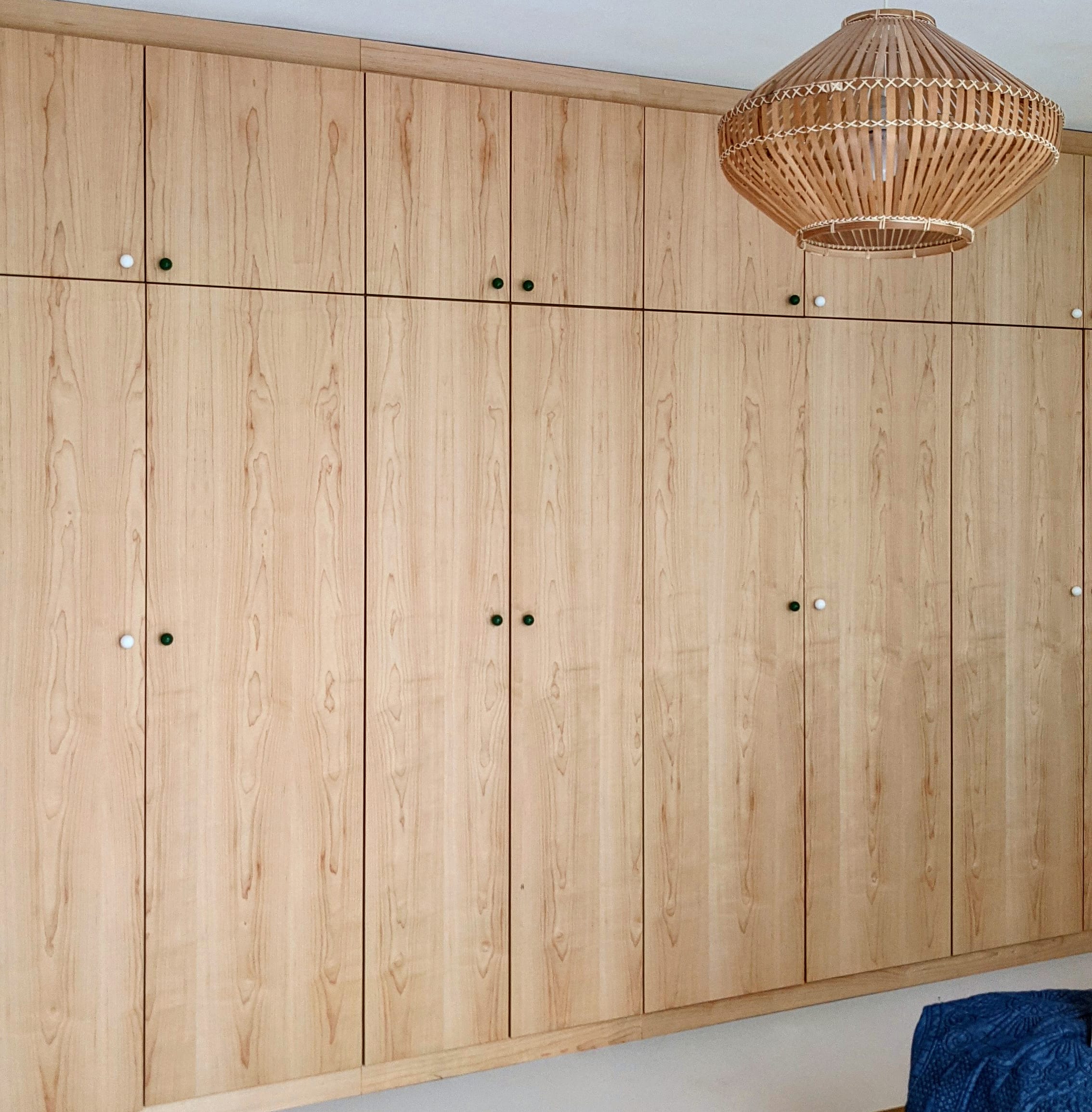 The client wanted a light coloured wood to brighten up the relatively dark bedroom which did not receive much sunlight. Maple with an oiled satin finish was chosen since it would also reflect any sunlight coming in through the balcony doors opposite. The wardrobe doors were split in half while taking care to maintain the continuous flow of the grain in each vertical panel. The veneer for all five wardrobes was sourced from the same tree to give the entire wall of doors a holistic look. The beautiful grain adds movement and life to the otherwise simple design of the doors.